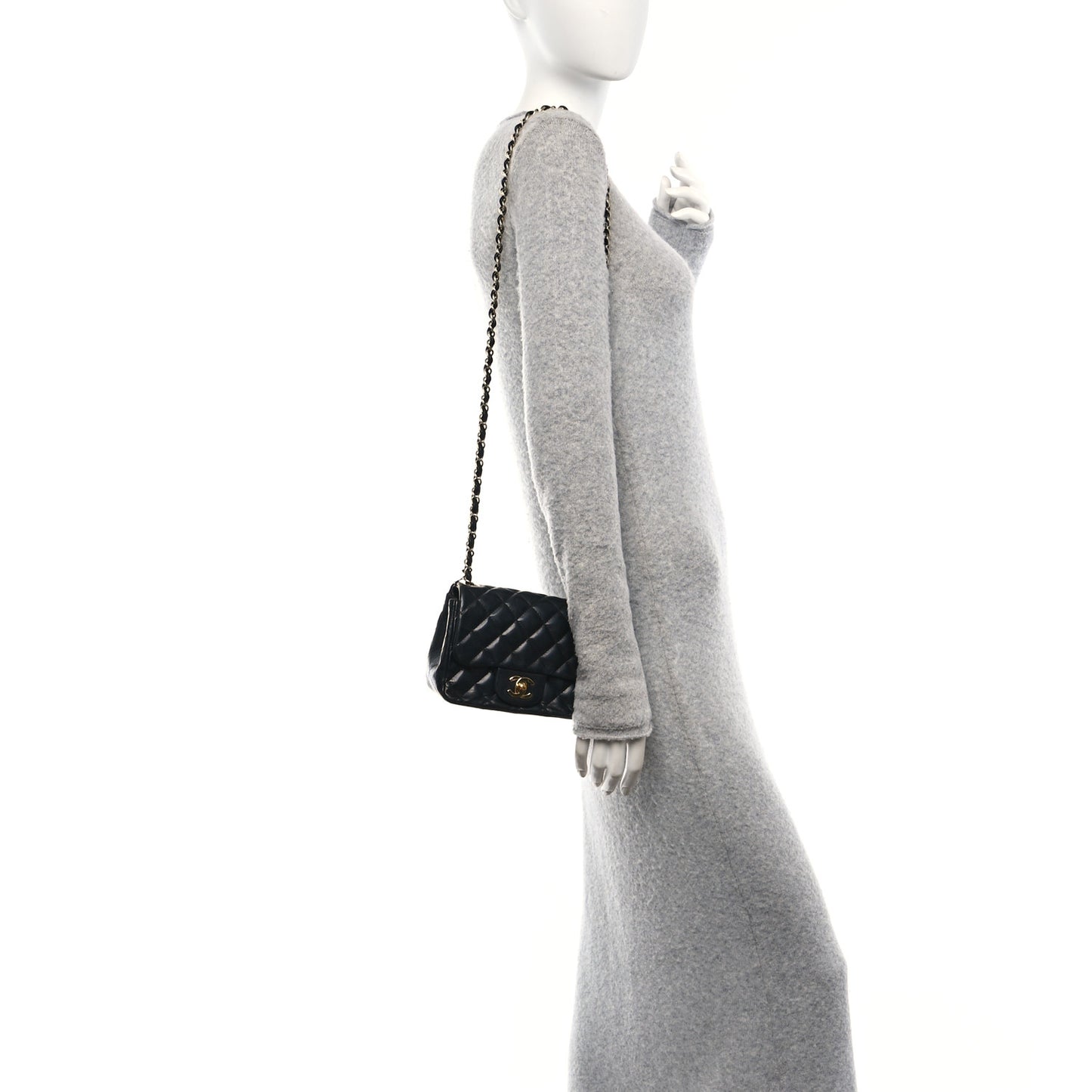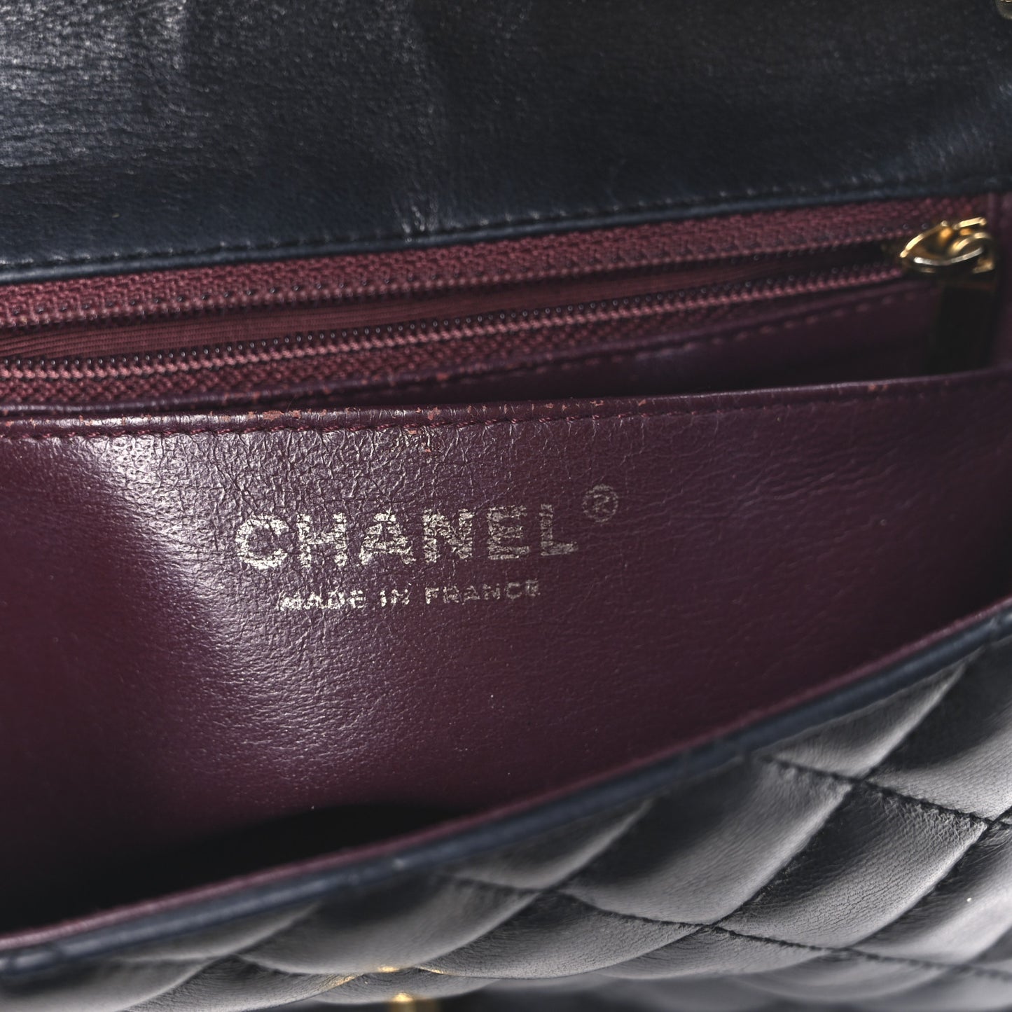 This is an authentic CHANEL Lambskin Quilted Mini Square Flap in Black. This classic bag is finely composed of luxurious diamond quilted lambskin leather in black. The bag features a waist-length polished gold chain link leather threaded shoulder strap and a polished gold Chanel CC turn lock. This opens the front flap to a black leather interior with zipper and patch pockets.Follow this item for alerts. Chanel is a registered trademark of Chanel. FASHIONPHILE is not affiliated with Chanel.