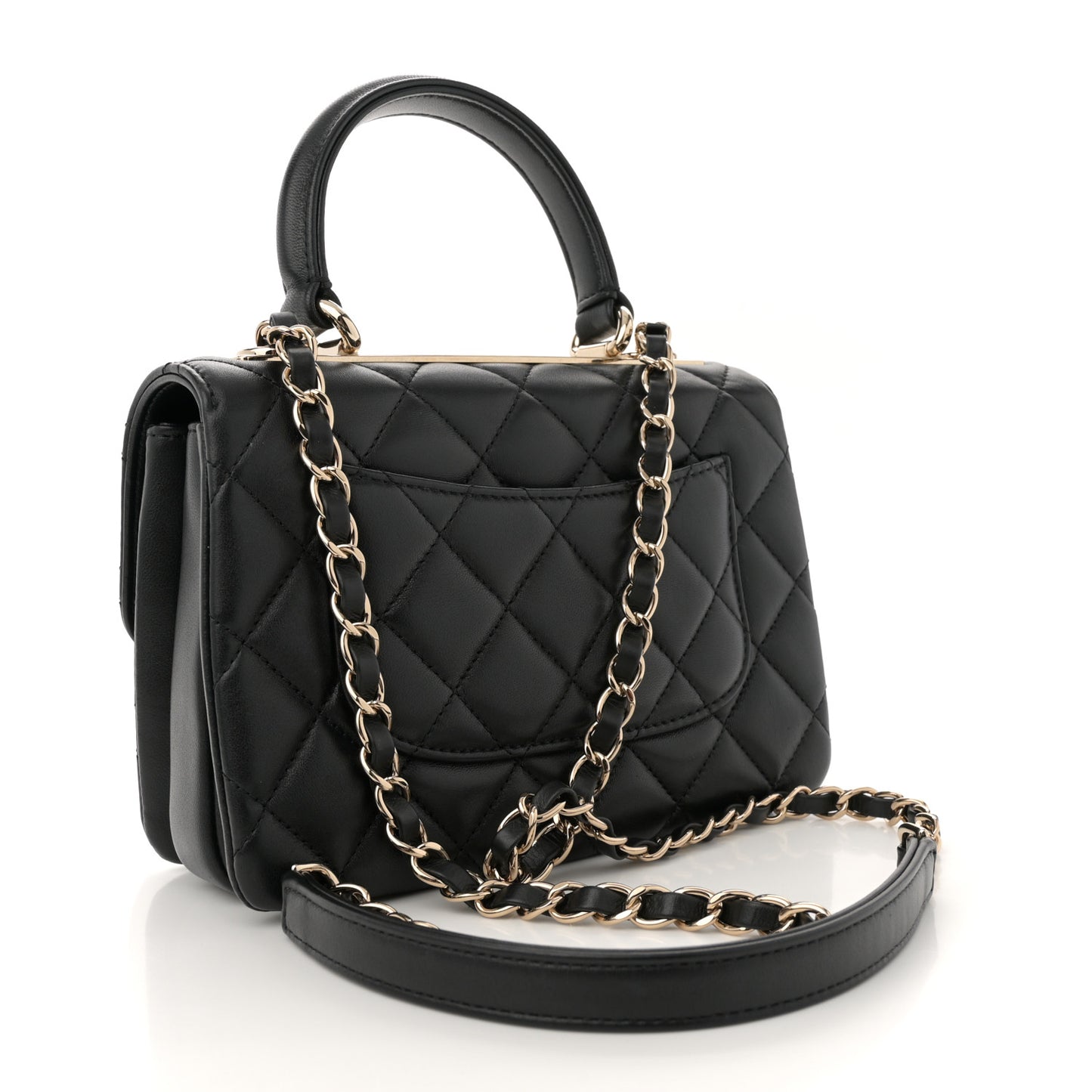 This is an authentic CHANEL Lambskin Quilted Mini Trendy CC Dual Handle Flap Bag in Black. This stylish handbag is crafted of diamond quilted lambskin leather in black. It features a rear patch pocket, a leather top handle with a Chanel logo plate, and a leather threaded chain strap. The flap opens with a light gold CC turn lock to a partitioned leather interior with a zipper pocket.Follow this item for alerts. Chanel is a registered trademark of Chanel. FASHIONPHILE is not affiliated with Chanel.