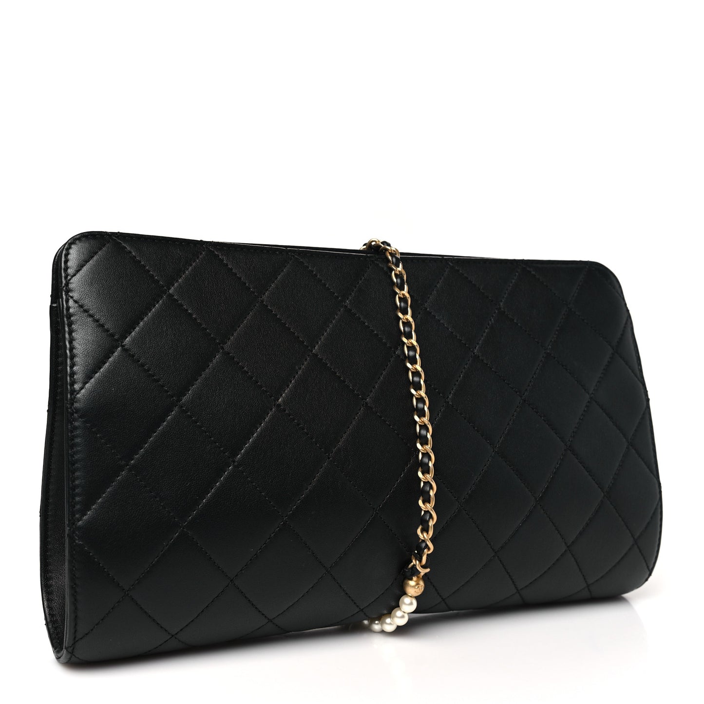 This is an authentic CHANEL Lambskin Quilted Pearl Clutch in Black. This stylish clutch is crafted of diamond quilted lambskin leather in black. It features a matte gold and faux turn lock. This opens to a red interior with a zipper and patch pocket.Follow this item for alerts. Chanel is a registered trademark of Chanel. FASHIONPHILE is not affiliated with Chanel.