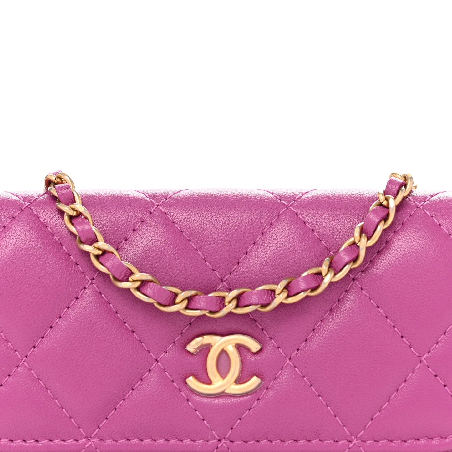 This is an authentic CHANEL Lambskin Quilted Pearl Crush Flap With Chain in Purple. This chic crossbody flap bag is crafted of soft diamond-quilted lambskin leather in purple. The bag features an aged gold chain-link shoulder strap threaded with leather that has a round gold cinch adjustment. The crossover flap opens with a Chanel CC closure to a gold fabric interior.Follow this item for alerts. Chanel is a registered trademark of Chanel. FASHIONPHILE is not affiliated with Chanel.