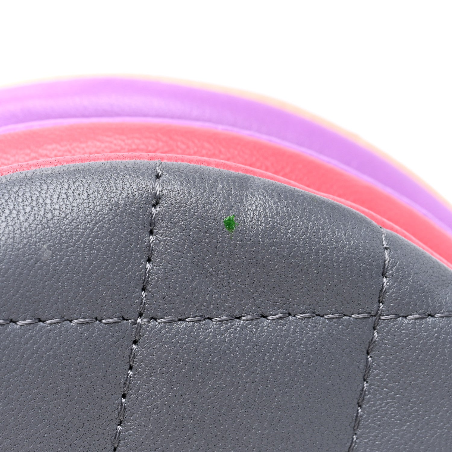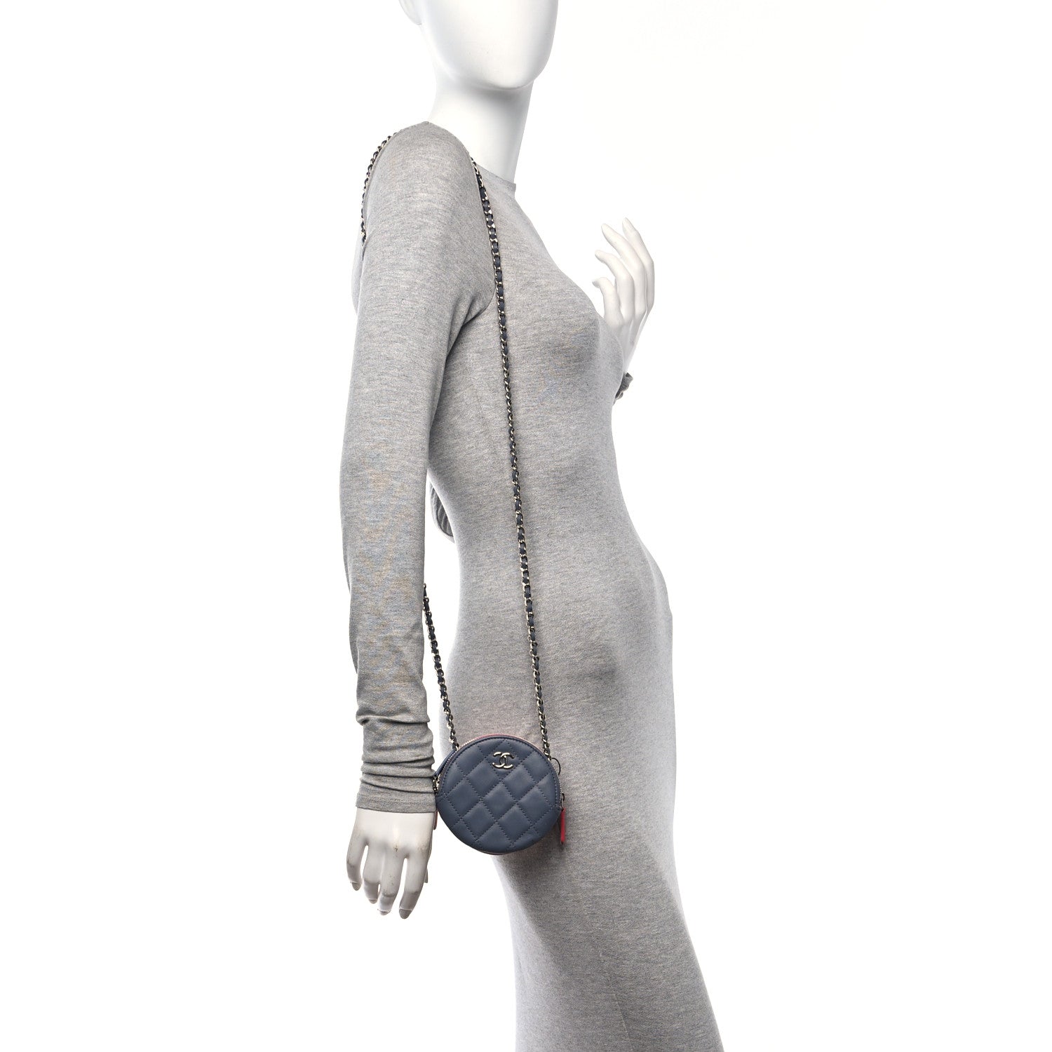 This is an authentic CHANEL Lambskin Quilted Round Clutch With Chain in Multicolor. This stylish crossbody bag is crafted of luxurious diamond-quilted lambskin leather. The bag features a leather-threaded polished silver chain-link shoulder strap and a matching Chanel CC logo on the front. The wrap-around zipper opens the bag to a gray fabric interior.Follow this item for alerts. Chanel is a registered trademark of Chanel. FASHIONPHILE is not affiliated with Chanel.