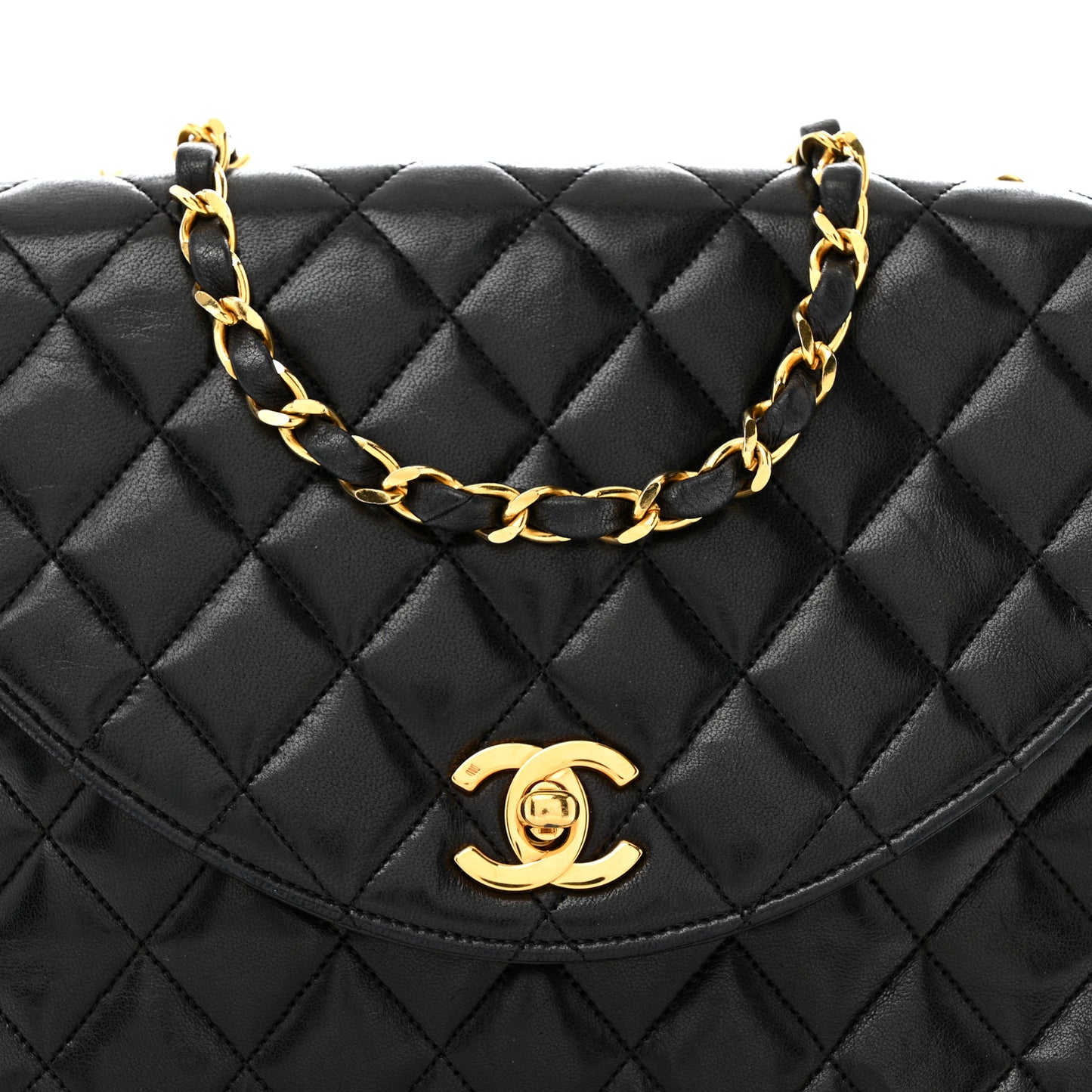 This is an authentic CHANEL Lambskin Quilted Medium Single Flap. This classic Diana model is finely composed of supple diamond-quilted lambskin leather in black. The bag features a waist-length polished gold chain link leather threaded shoulder strap and a gold-plated Chanel CC logo on the front of the flap. The flap opens to a burgundy leather interior with a hanging zipper compartment.Follow this item for alerts. Chanel is a registered trademark of Chanel. FASHIONPHILE is not affiliated with Chanel.