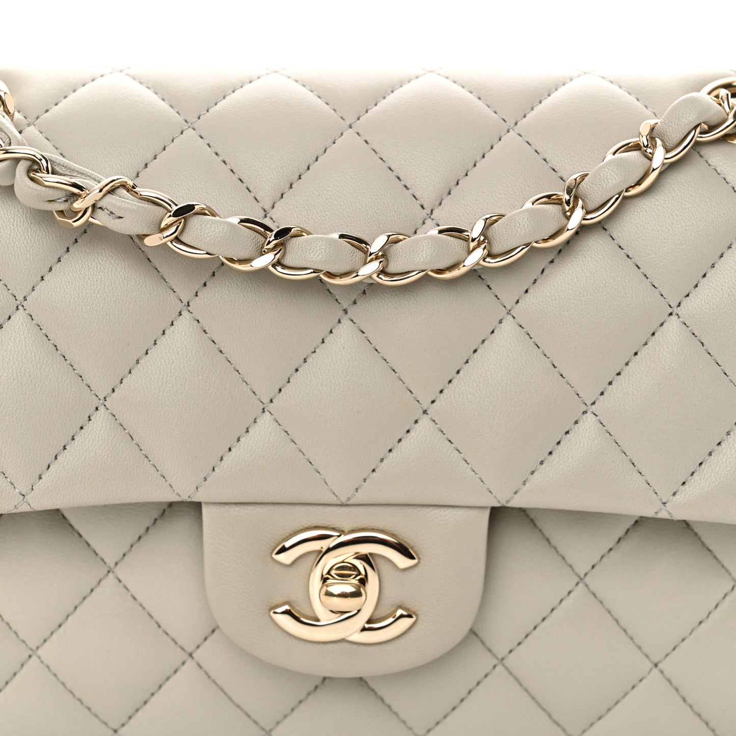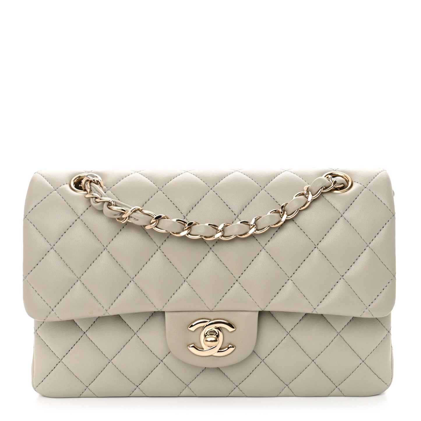 This is an authentic CHANEL Lambskin Quilted Small Double Flap in Grey. This classic shoulder bag is crafted of diamond quilted lambskin leather in grey. It features a leather-threaded polished light gold chain shoulder strap, a flat rear pocket, and a light gold CC turn-lock on the flap. This opens to reveal an inner flap and a matching grey leather interior with patch pockets.Follow this item for alerts. Chanel is a registered trademark of Chanel. FASHIONPHILE is not affiliated with Chanel.
