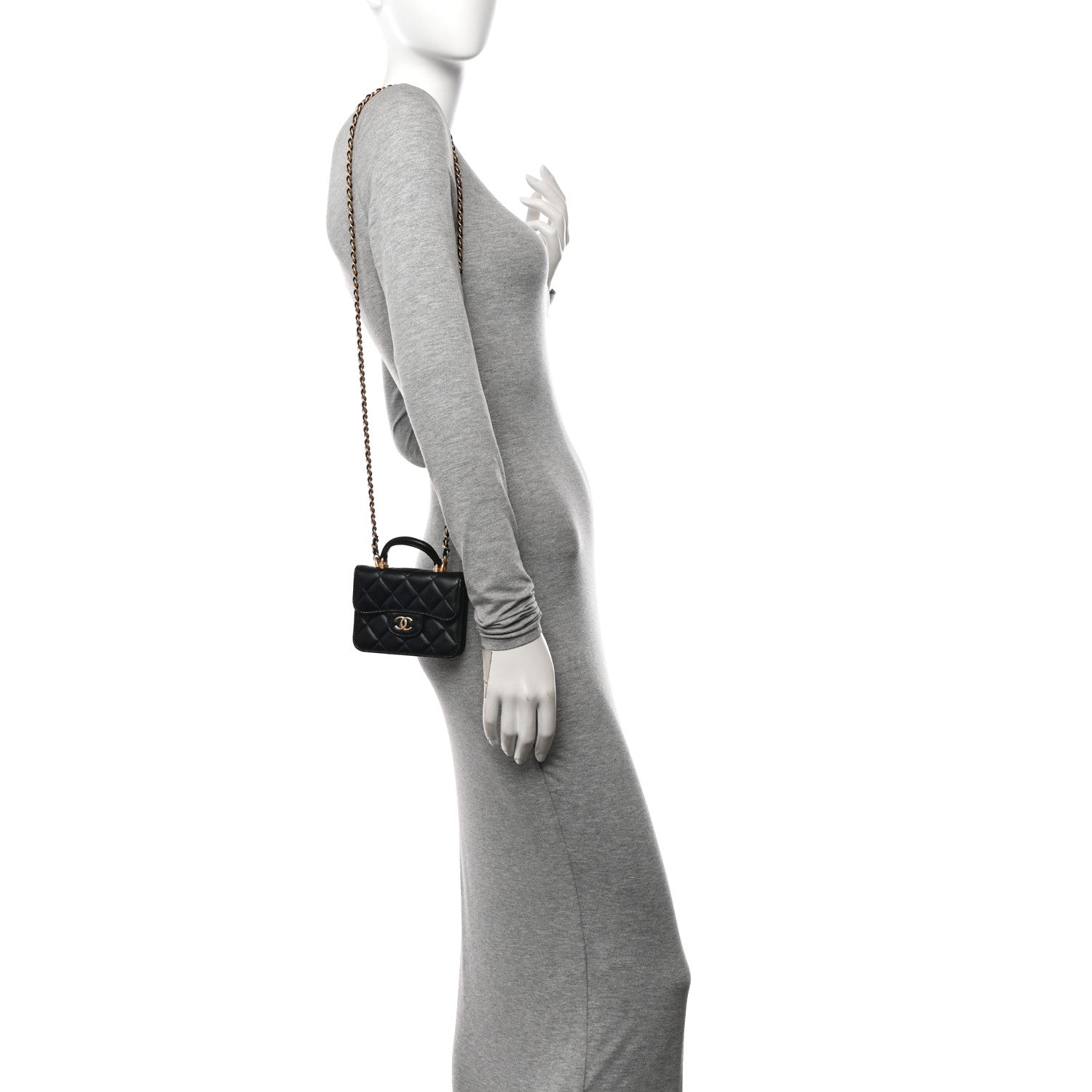This is an authentic CHANEL Lambskin Quilted Top Handle Flap Coin Purse With Chain in Black. This stylish bag is crafted of luxuriously soft diamond quilted lambskin leather in black. The bag features a gold chain leather threaded shoulder strap and a facing flap with a gold Chanel CC logo. The flap opens to a matching fabric interior.Follow this item for alerts. Chanel is a registered trademark of Chanel. FASHIONPHILE is not affiliated with Chanel.