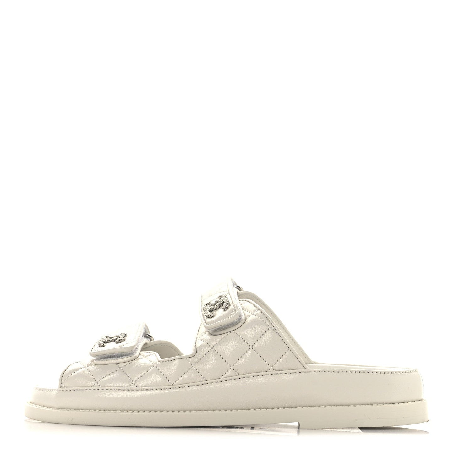 Lambskin Quilted Velcro Dad Chain CC Slide Sandals 38 White