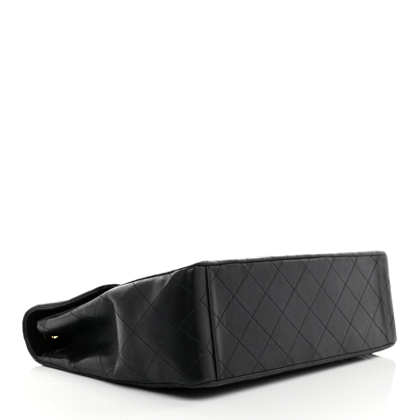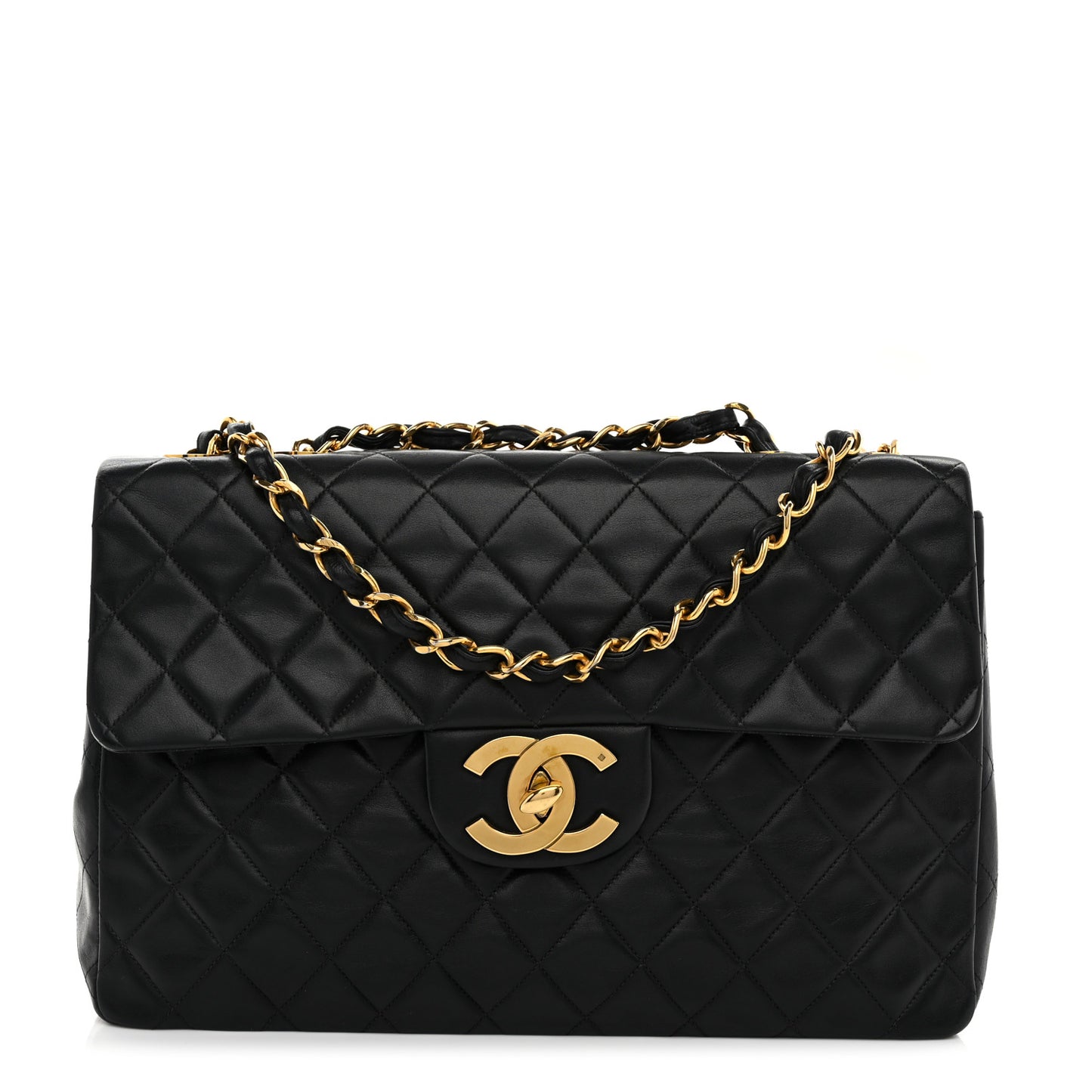 This is an authentic CHANEL Lambskin Quilted XL Jumbo Single Flap in Black. This stunning flap bag is finely crafted of quilted black lambskin leather. The bag features a gold chain-link shoulder strap threaded with black leather, a rear patch pocket, a frontal flap, and an oversized 24k gold plated Chanel CC turn-lock. This opens to a burgundy leather interior with zipper and patch pockets.Follow this item for alerts. Chanel is a registered trademark of Chanel. FASHIONPHILE is not affiliated with Chanel.