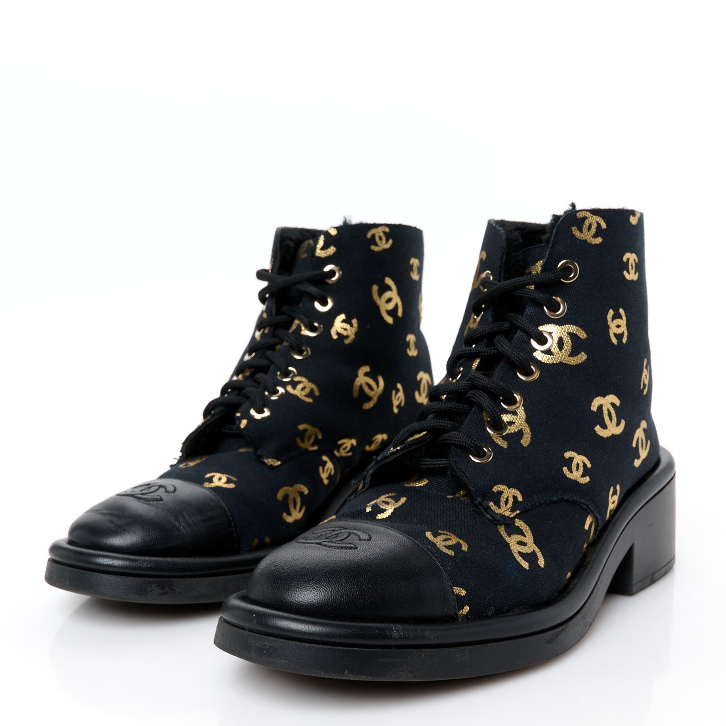This is an authentic pair of CHANEL Lambskin Shearling Canvas CC Lace Up Boots size 38.5 in Black and Gold. These above-the-ankle boots are crafted of black canvas with gold Chanel CC logos. They feature a 2-inch block heel, leather cap toe with a quilted Chanel CC logo, and black laces.Follow this item for alerts. Chanel is a registered trademark of Chanel. FASHIONPHILE is not affiliated with Chanel.
