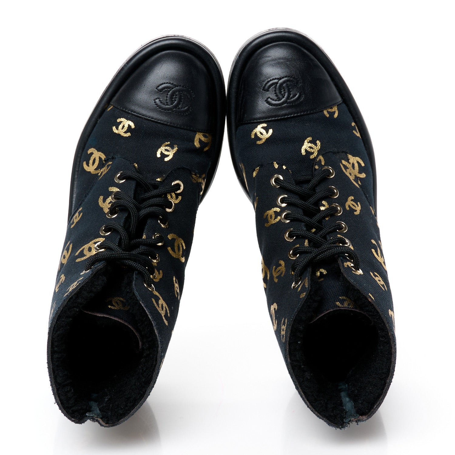 Chanel/ Accessories/ Shoes /Chanel Lambskin Shearling Canvas CC Lace Up Boots 38.5 Black Gold