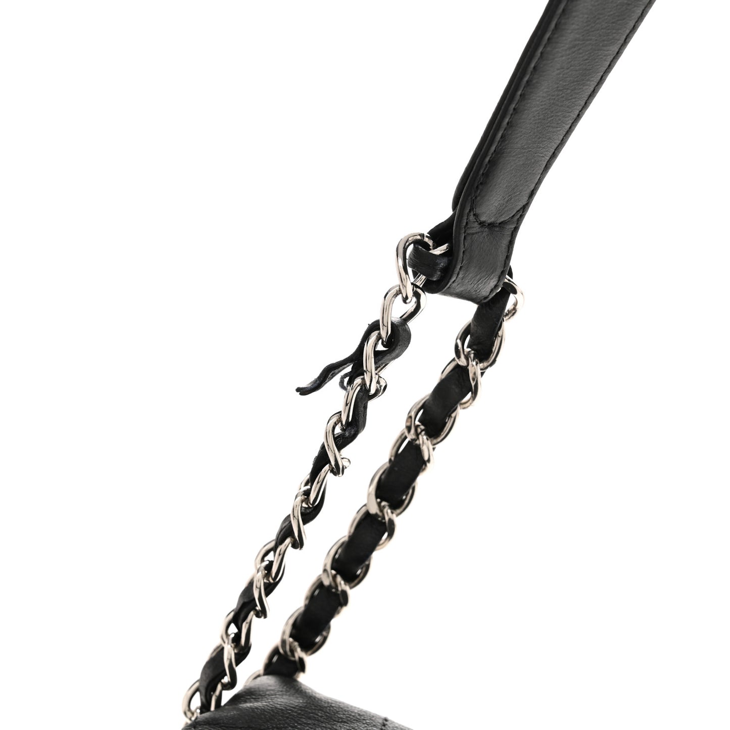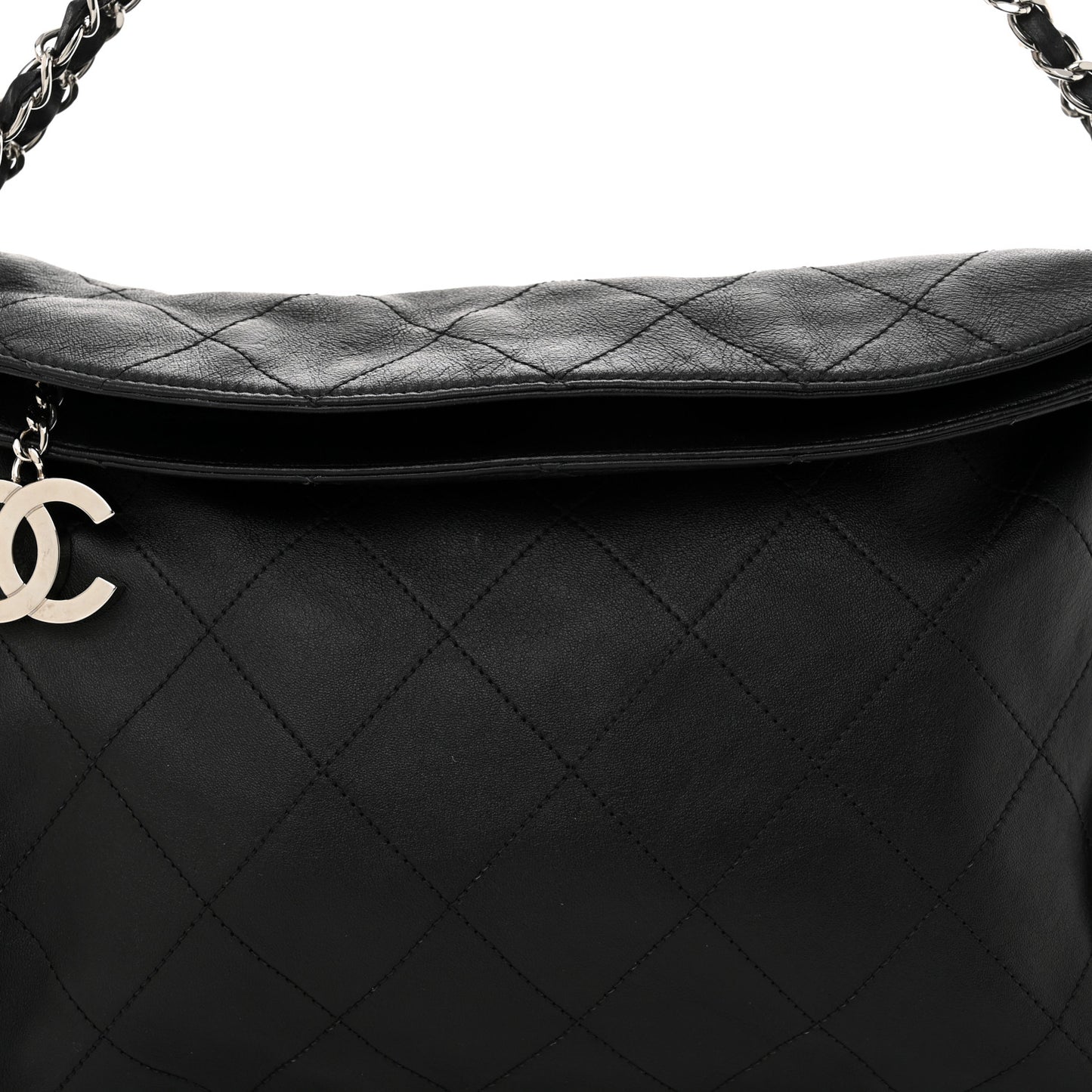 This is an authentic CHANEL Lambskin Stitched Medium Ultimate Soft Tote in Black. This chic bag is crafted of beautiful soft and supple diamond quilted lambskin leather in black. This stylish shoulder bag has leather threaded polished silver chain links with a leather shoulder pad and side patch pockets embossed with CC logos. The large silver Chanel CC top zipper pull opens to a black jacquard Chanel print interior with a zipper pocket.Follow this item for alerts. Chanel is a registered trademark of Chanel. FASHIONPHILE is not affiliated with Chanel.
