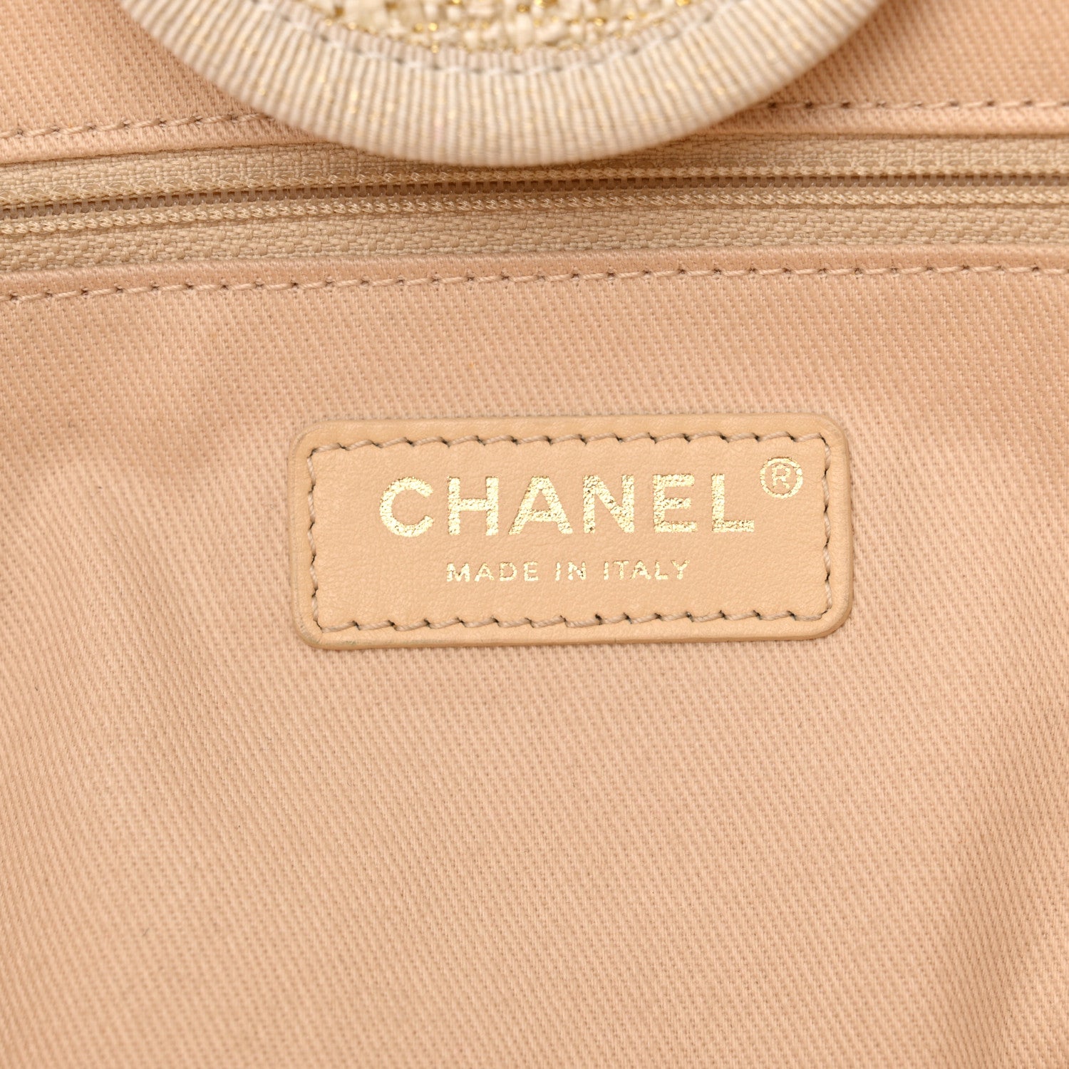 This is an authentic CHANEL Lurex Boucle Medium Deauville Tote in White. This lovely woven tote is crafted of fine mixed fibers and lurex with the iconic Chanel logo in white. The bag features cross grain threaded gold chain shoulder strap, cross grain canvas trim, and an open top. The beige fabric interior features zipper and patch pockets.Follow this item for alerts. Chanel is a registered trademark of Chanel. FASHIONPHILE is not affiliated with Chanel.
