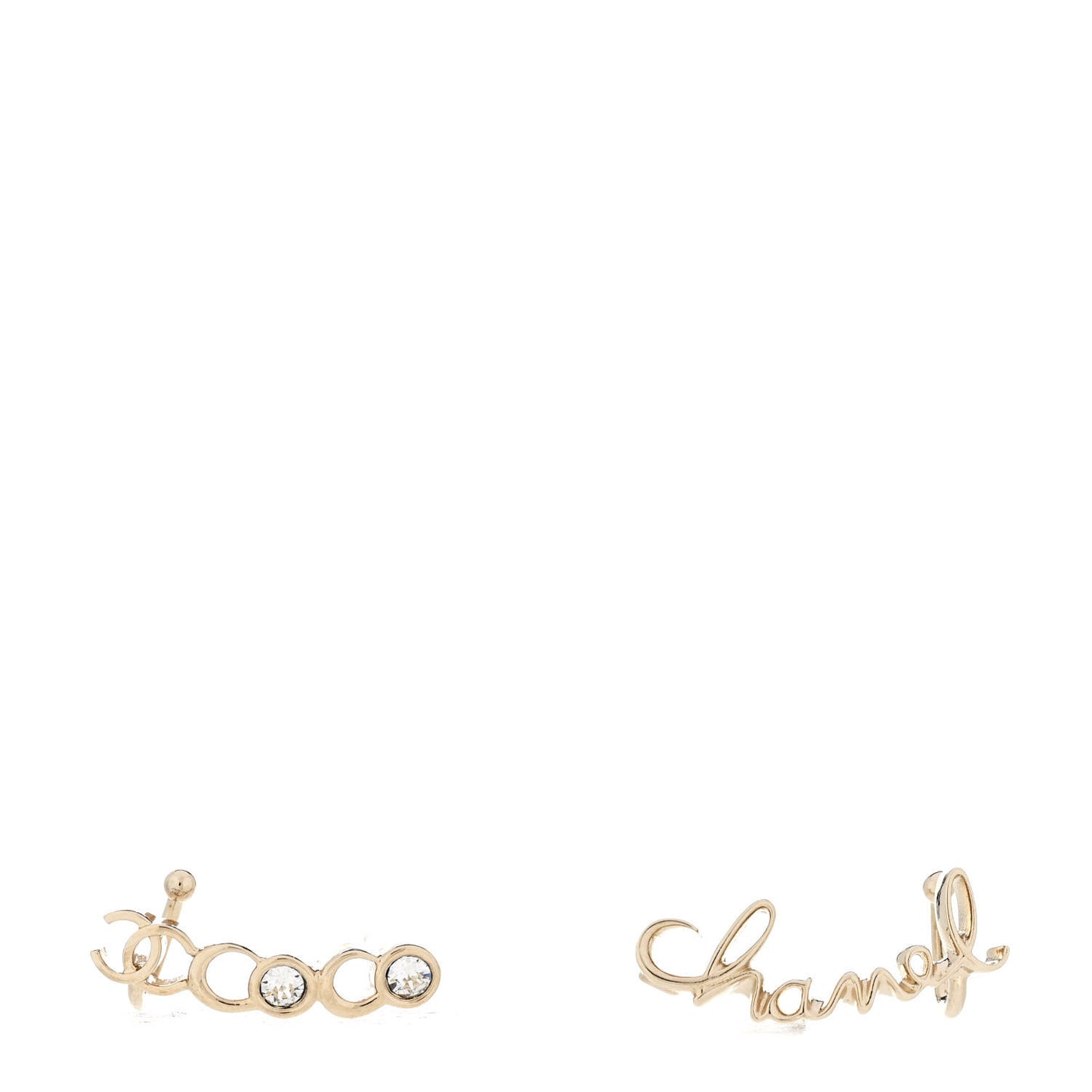 These are authentic CHANEL Metal Crystal Coco Script CC Climber Earrings in Gold. These luxurious earrings feature Coco Chanel in script accented with crystals.Follow this item for alerts. Chanel is a registered trademark of Chanel. FASHIONPHILE is not affiliated with Chanel.
