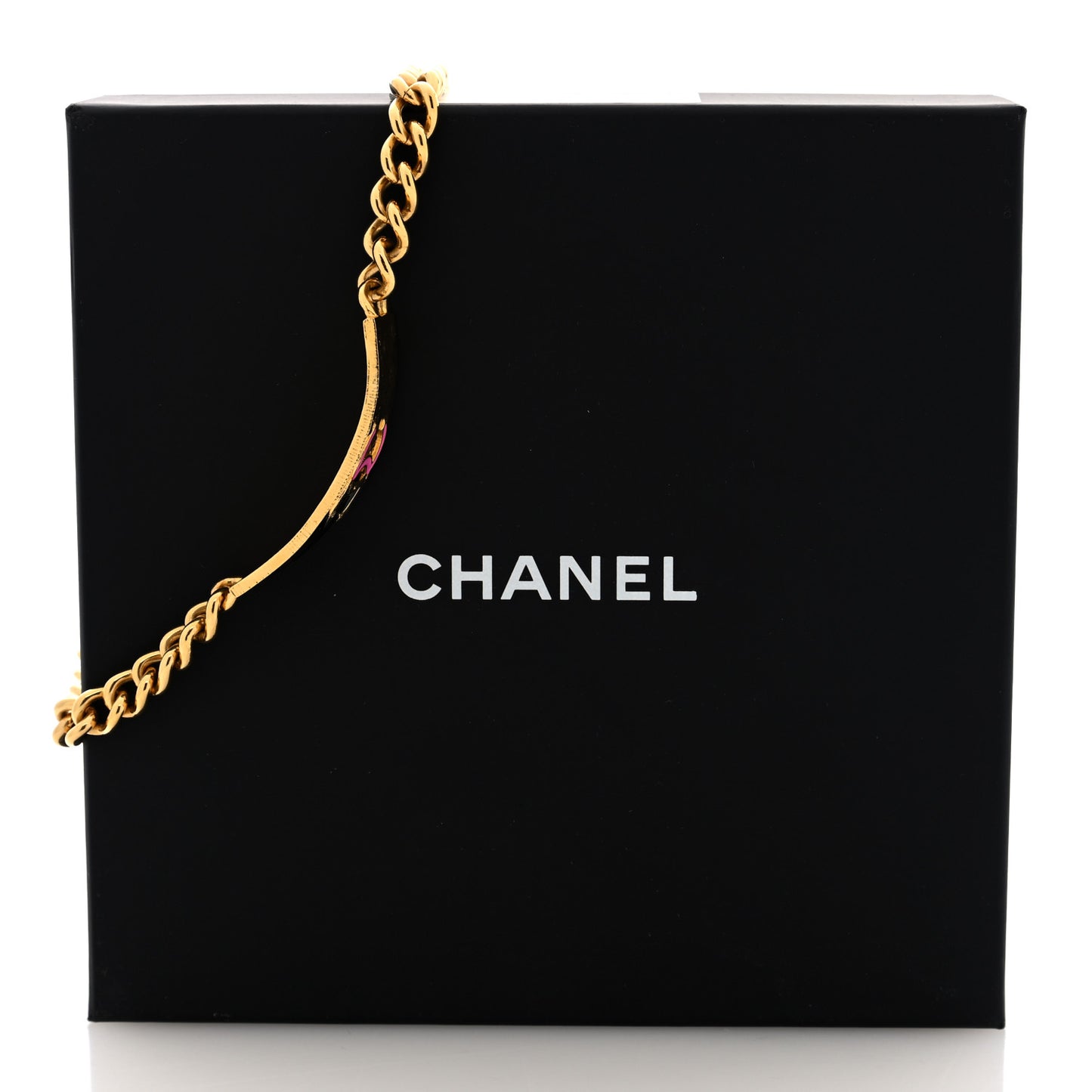 This is an authentic pair of CHANEL Metal Metal Enamel CC ID Choker Necklace in Gold, Black, and Pink. This stylish choker features a gold plated band with an enamel pink and gold round Chanel "CC" pendant towards the middle of the choker.Follow this item for alerts. Chanel is a registered trademark of Chanel. FASHIONPHILE is not affiliated with Chanel.