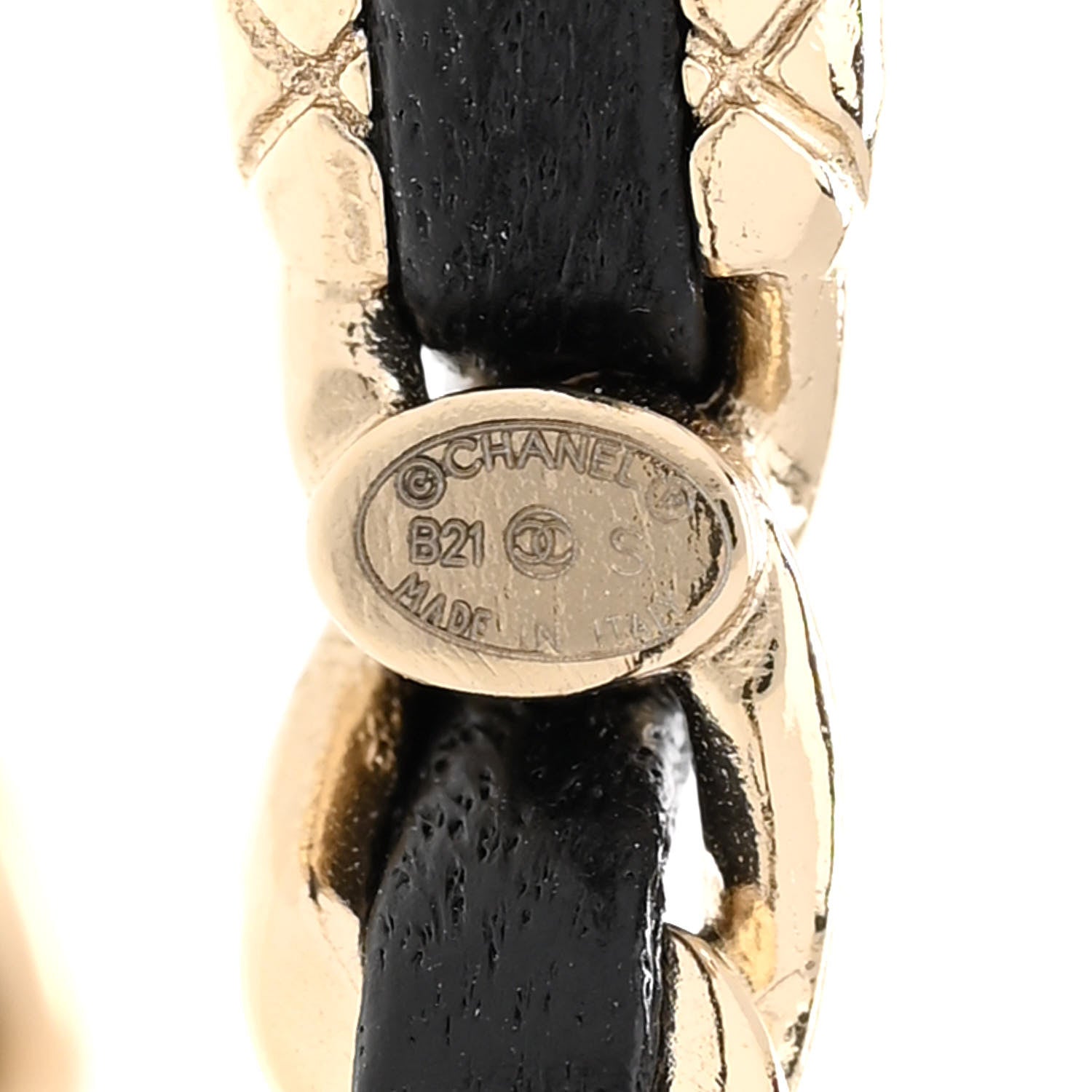 This is an authentic pair of CHANEL Metal Lambskin Quilted CC Turnlock Chain Hoop Earrings in Gold and Black. These lovely hoop earrings are quilted gold toned chain threaded with black leather and a Chanel CC turn lock detail.Follow this item for alerts. Chanel is a registered trademark of Chanel. FASHIONPHILE is not affiliated with Chanel.
