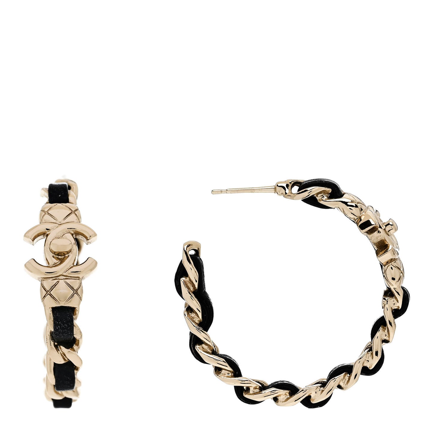 This is an authentic pair of CHANEL Metal Lambskin Quilted CC Turnlock Chain Hoop Earrings in Gold and Black. These lovely hoop earrings are leather threaded gold chain links with a Chanel CC logo.Follow this item for alerts. Chanel is a registered trademark of Chanel. FASHIONPHILE is not affiliated with Chanel.