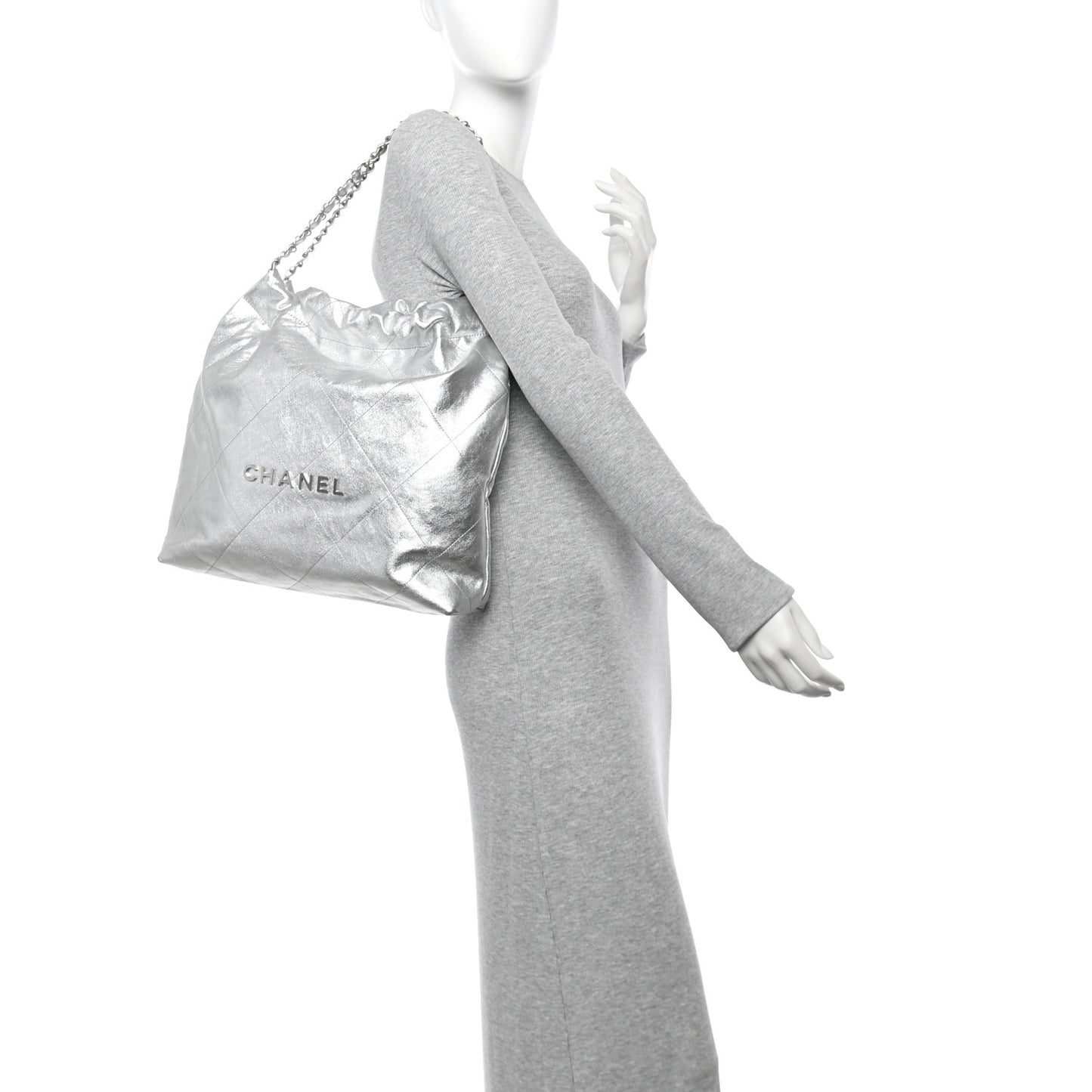 This is an authentic CHANEL Metallic Calfskin Quilted Chanel 22 in Silver. This drawstring bag is crafted of textured aged and shiny diamond-stitched leather in silver. This shoulder bag features a silver chain leather threaded shoulder strap with a silver Chanel charm. The bag is open to a diamond stitched fabric interior with a zipper pocket.Follow this item for alerts. Chanel is a registered trademark of Chanel. FASHIONPHILE is not affiliated with Chanel.
