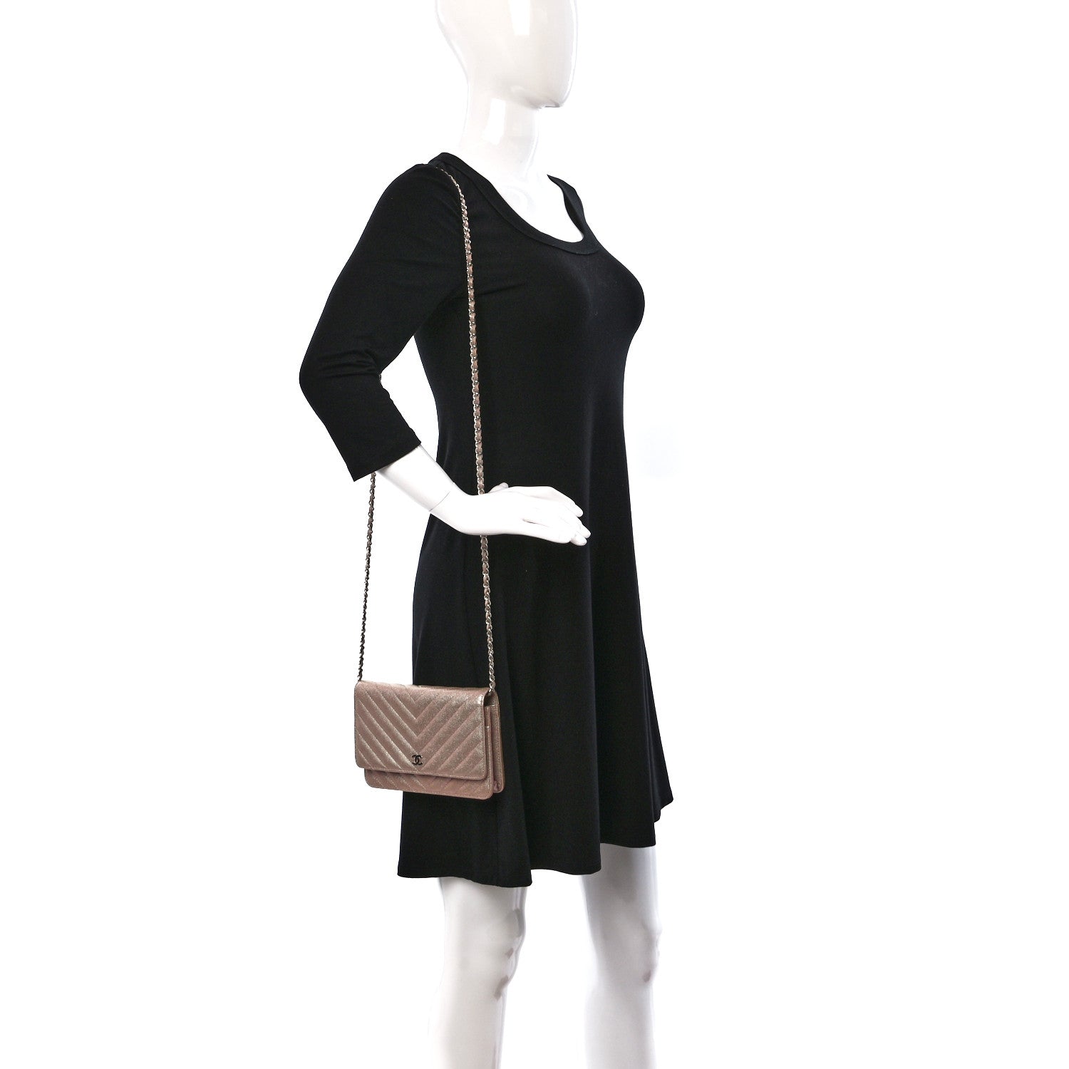 This is an authentic CHANEL Metallic Caviar Chevron Quilted Wallet On Chain WOC in Light Gold. This stylish shoulder bag is crafted of luxurious chevron-quilted caviar leather in iridescent pink-gold. The bag features a long silver chain link leather threaded shoulder strap and a frontal silver Chanel CC logo. This wallet unsnaps to a beige fabric interior with a panel of card slots, flat pockets, and a zippered compartment.Follow this item for alerts. Chanel is a registered trademark of Chanel. FASHIONPHILE is not affiliated with Chanel.
