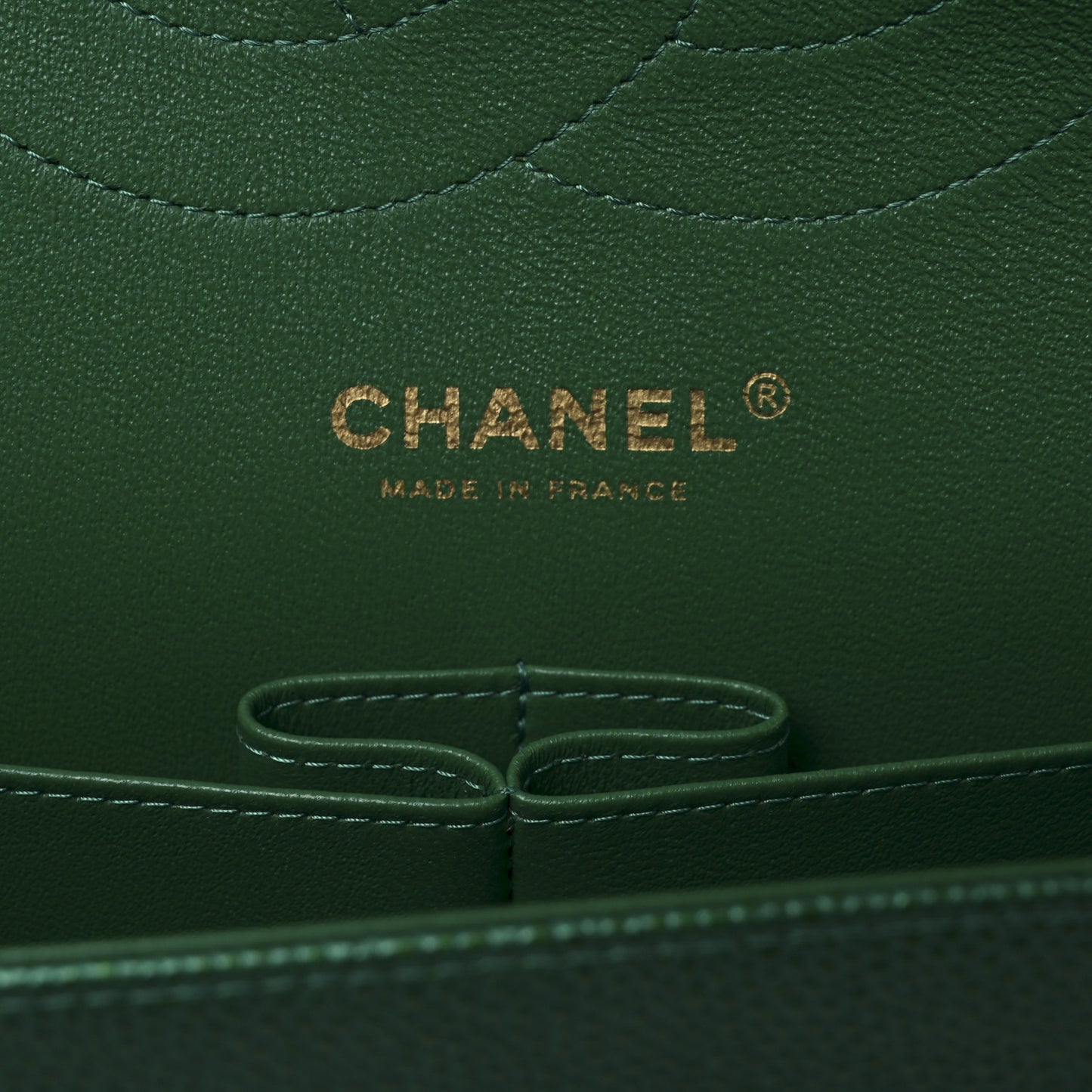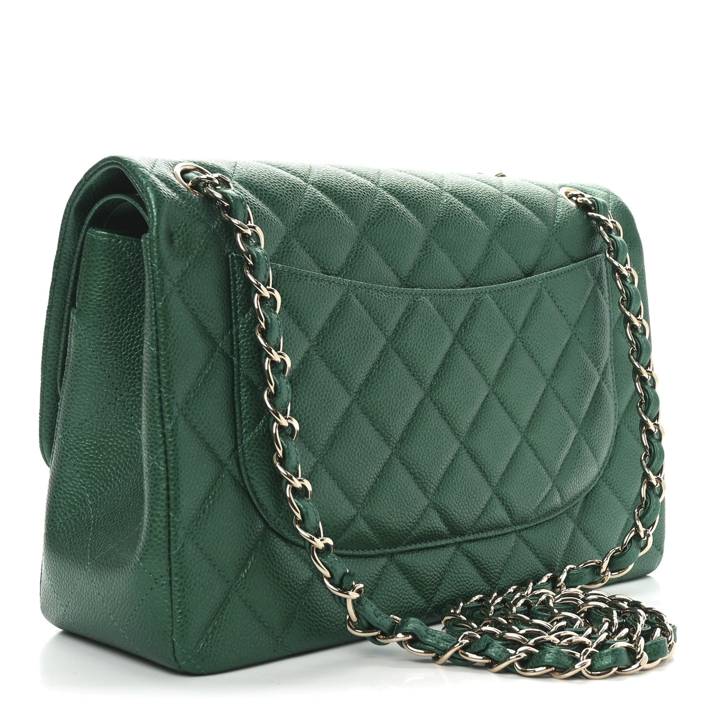 This is an authentic CHANEL Metallic Caviar Quilted Jumbo Double Flap in Green. This classic flap bag is crafted of diamond quilted caviar leather in green. It features leather threaded gold chain link shoulder straps, an exterior rear flat pocket, and a front flap with a polished gold CC turn lock. This opens to a second flap and a matching leather interior with patch pockets.Follow this item for alerts. Chanel is a registered trademark of Chanel. FASHIONPHILE is not affiliated with Chanel.