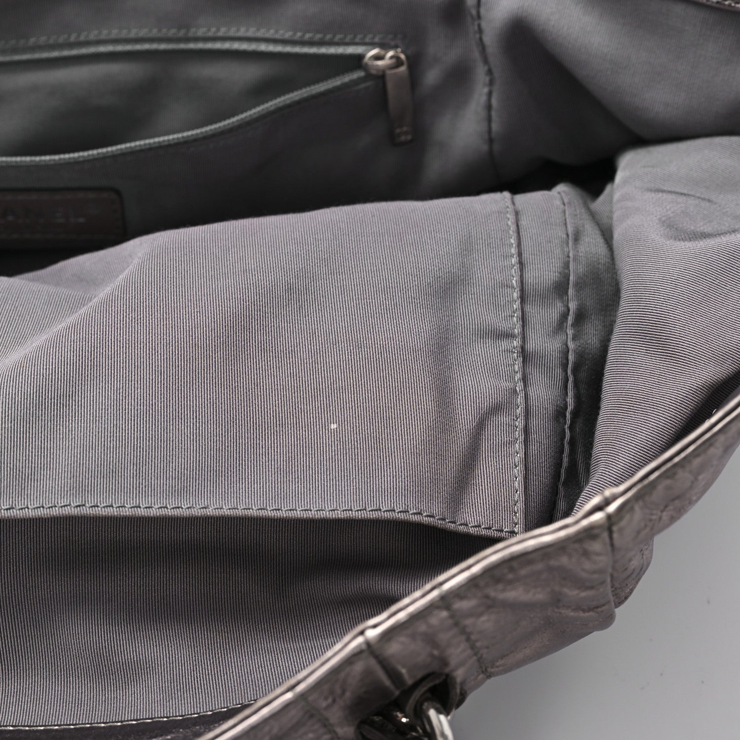 This is an authentic CHANEL Metallic Cracked Calfskin Modern Chain Tote in Dark Silver. This tote is crafted of dark silver cracked calfskin leather and silver hardware. The top opens to a gray fabric interior with a zipper pocket and patch pockets.Follow this item for alerts. Chanel is a registered trademark of Chanel. FASHIONPHILE is not affiliated with Chanel.