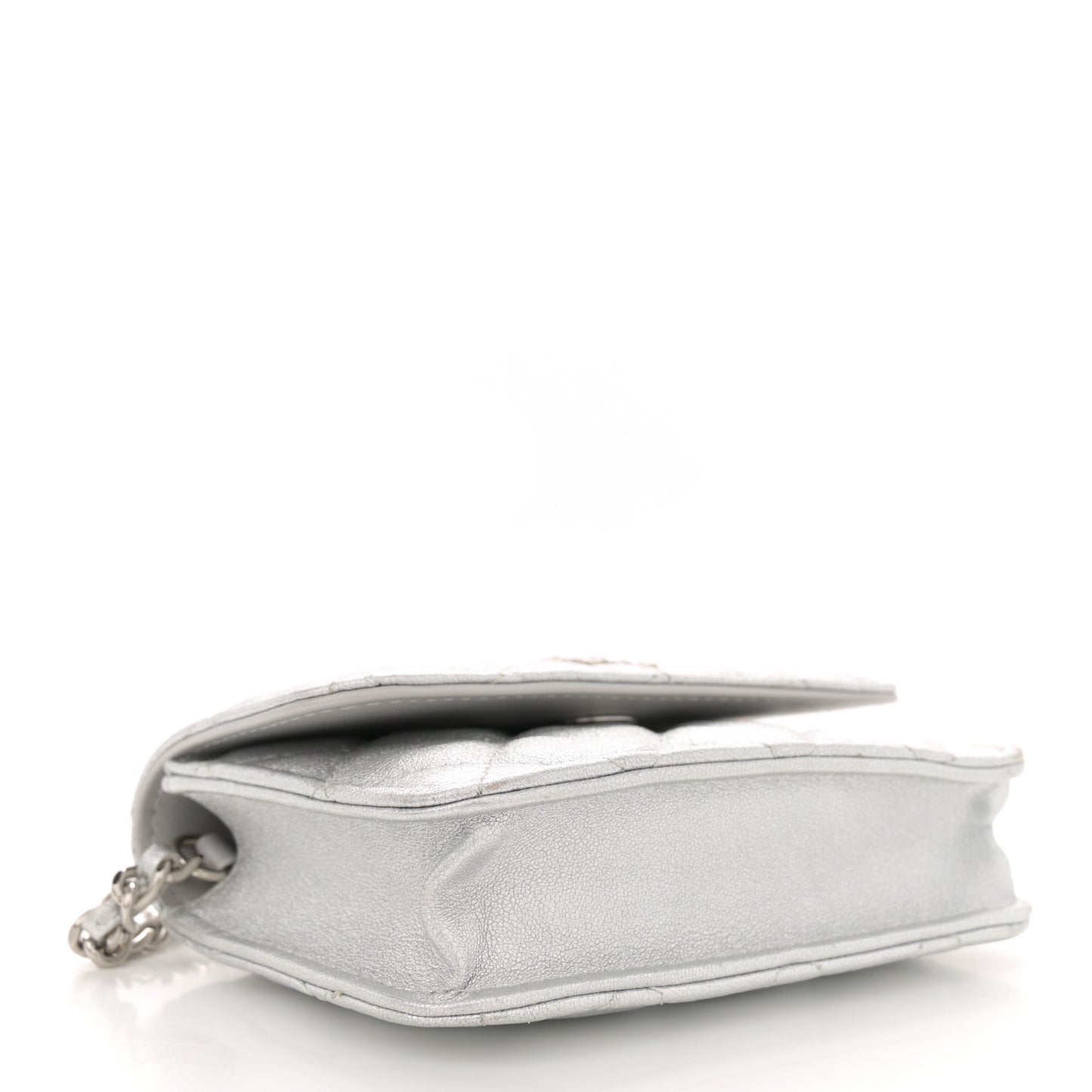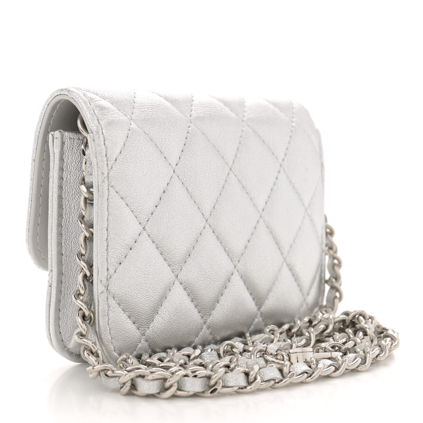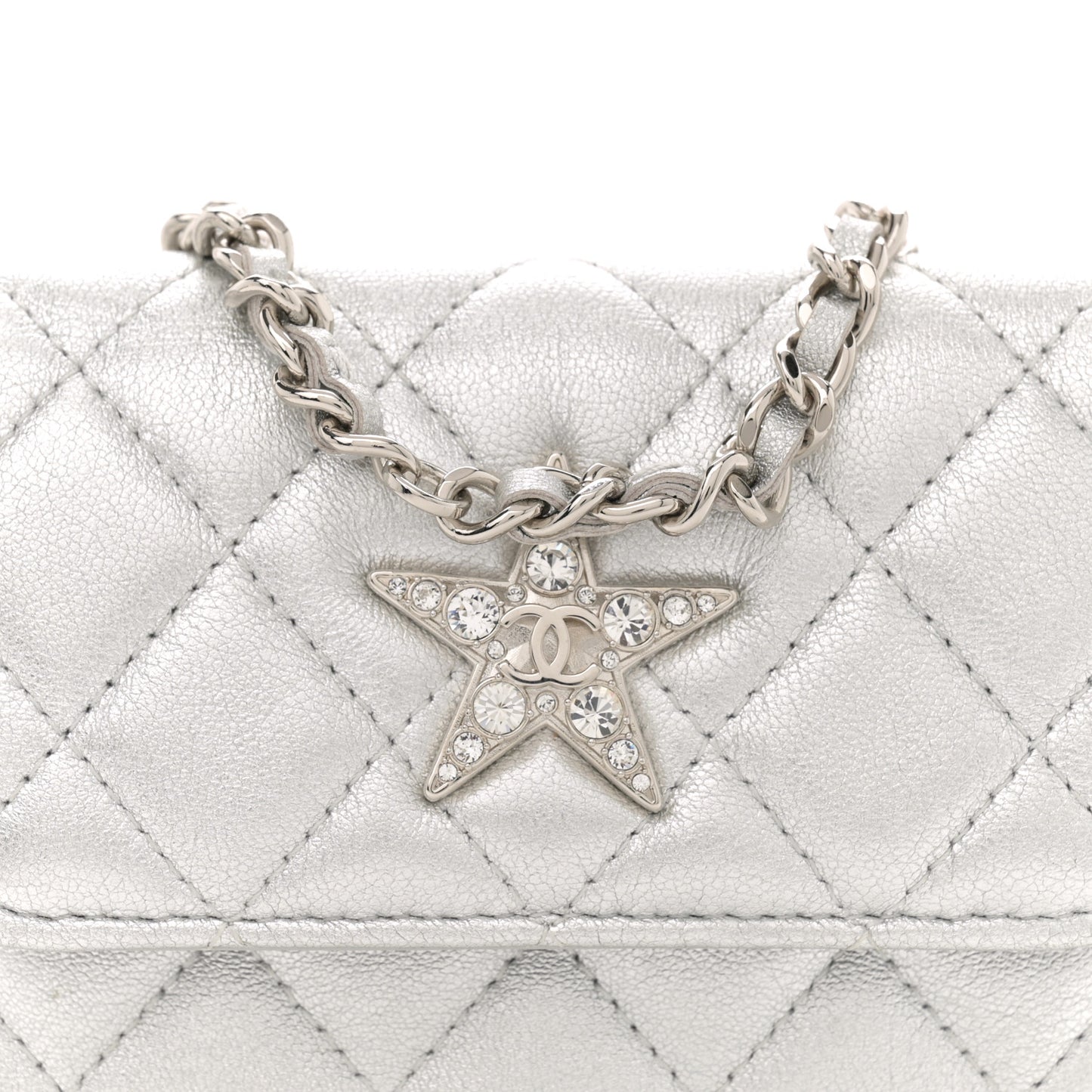 This is an authentic CHANEL Metallic Goatskin Quilted Star Flap Waist Belt Bag in Silver. This belt bag is crafted of grained diamond quilted leather in metallic silver. The bag features a silver leather threaded chain belt strap and silver CC logo on a crystal embellished star motif. The front flap opens to a light grey fabric interior.Follow this item for alerts. Chanel is a registered trademark of Chanel. FASHIONPHILE is not affiliated with Chanel.