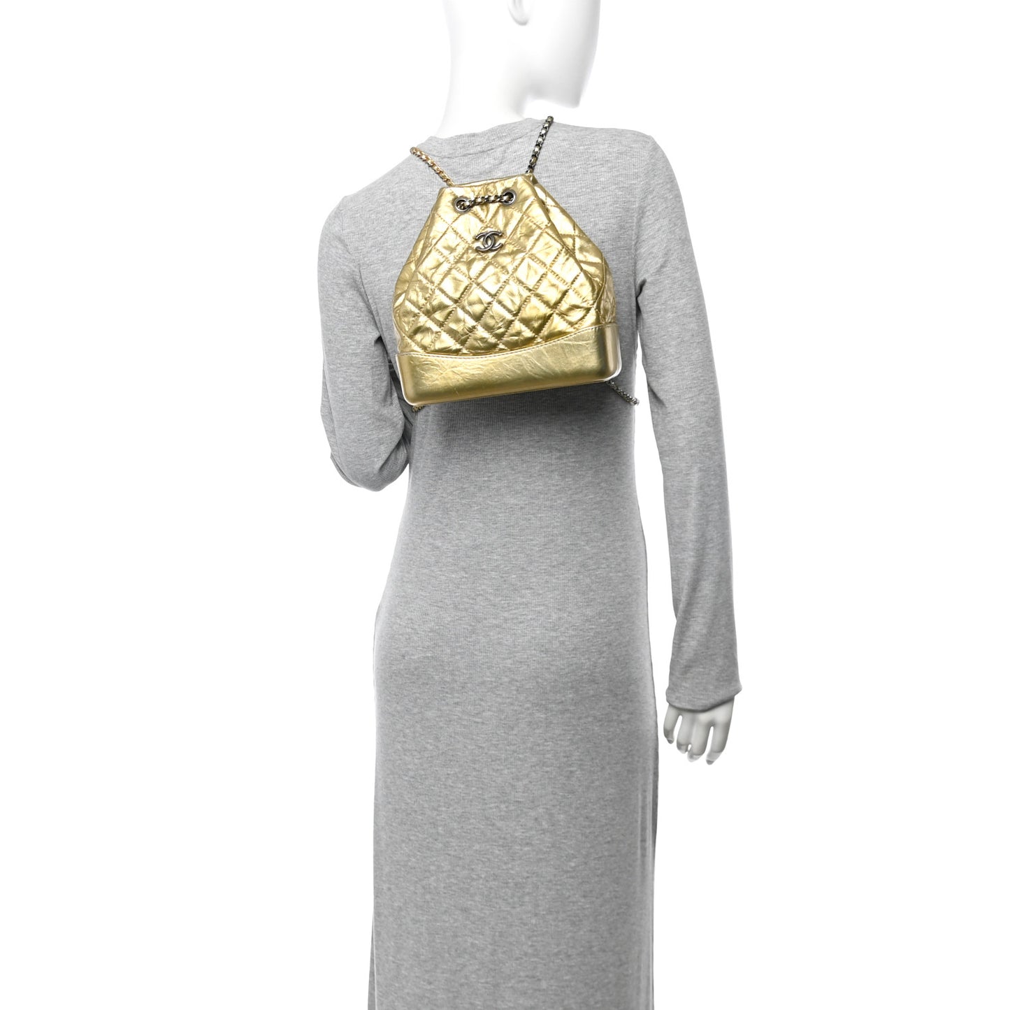 This is an authentic CHANEL Iridescent Lambskin Calfskin Small Quilted Gabrielle Backpack in Gold. This chic backpack is crafted of diamond-stitched iridescent gold lambskin leather and a smooth calfskin leather base. The shoulder bag features iridescent chain link leather threaded shoulder straps and an open top. The top opens to a spacious deep red fabric interior with a pocket. This stylish backpack has room for all your essentials with the timeless style only from Chanel!Follow this item for alerts. Chanel is a registered trademark of Chanel. FASHIONPHILE is not affiliated with Chanel.