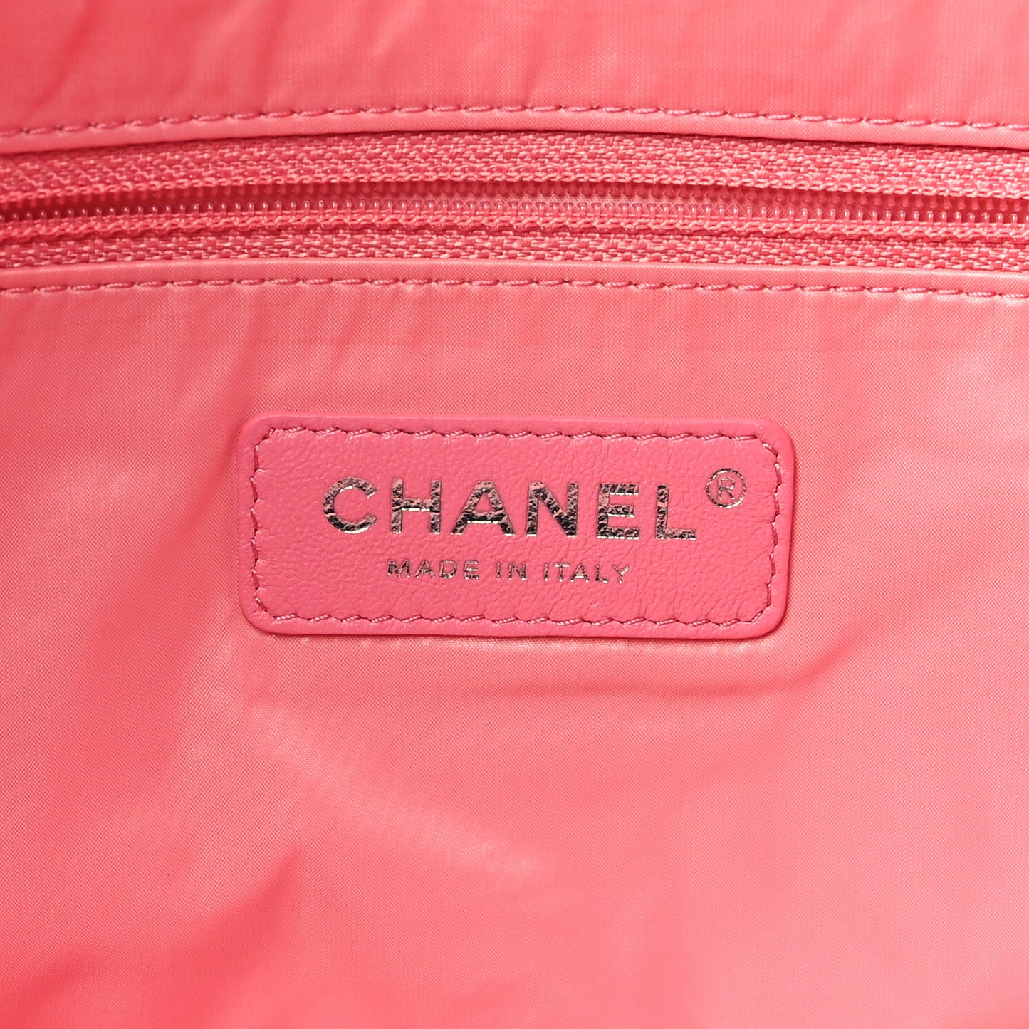 This is an authentic CHANEL Nylon Stitched Printed Logo Shopping Bag in Multicolor. This stylish tote is beautifully crafted of diamond stitched nylon in a white, pink, and blue color in an intricate design. The backpack features a blue leather top handle, a front zipper pocket, and fabric adjustable shoulder straps. The main zipper opens to a pink fabric interior with a deep zipper pocket and patch pockets.Follow this item for alerts. Chanel is a registered trademark of Chanel. FASHIONPHILE is not affiliated with Chanel.
