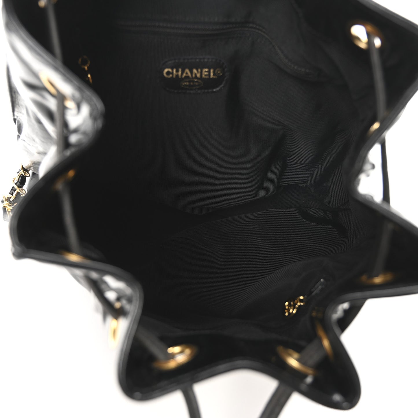 This is an authentic CHANEL Paten Timeless CC Drawstring Backpack in Black. This luxurious backpack is crafted of fine black patent leather. The bag features flat leather straps with chain-link leather threaded ends. The drawstring opens to a spacious black fabric interior with a zipper pocket.Follow this item for alerts. Chanel is a registered trademark of Chanel. FASHIONPHILE is not affiliated with Chanel.