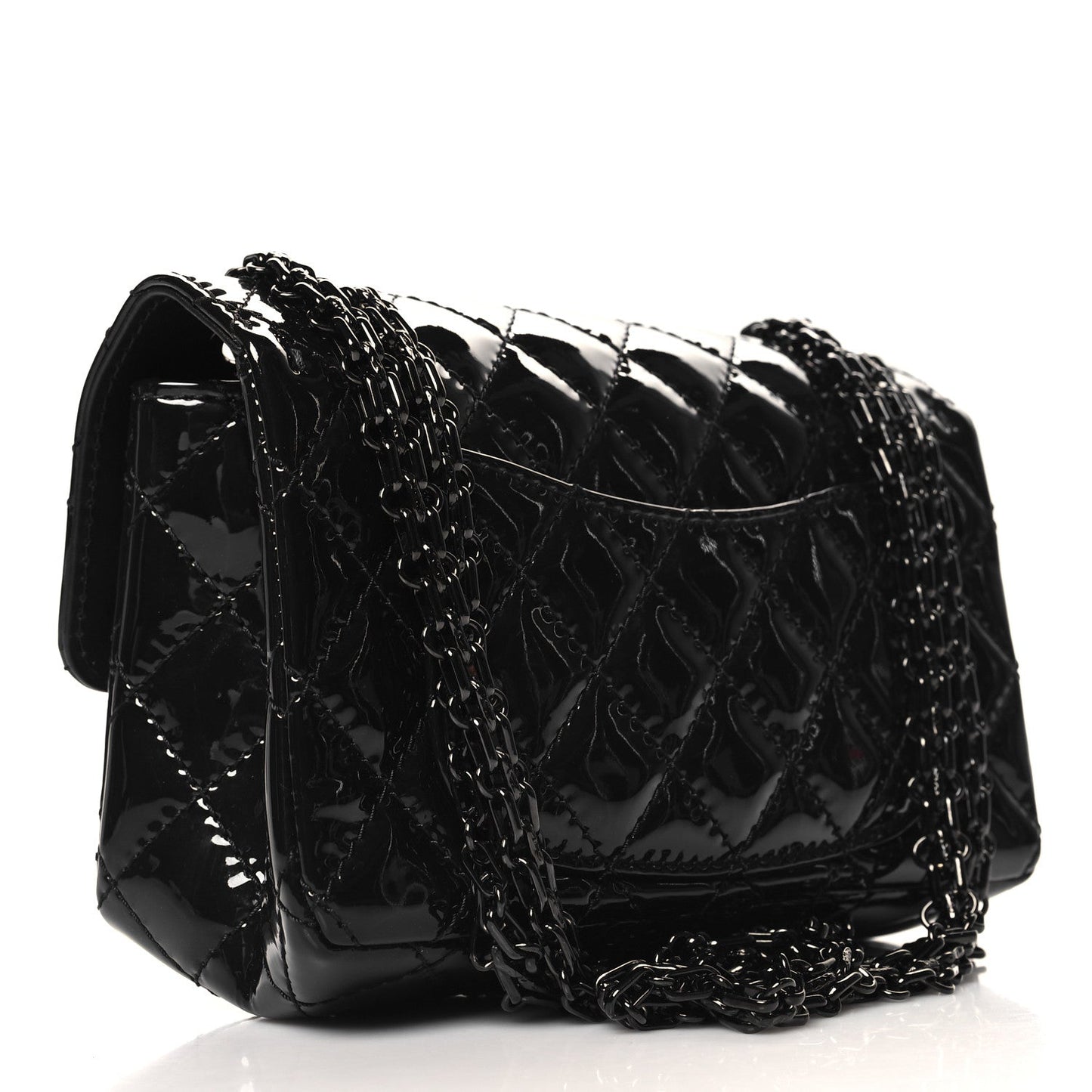 This is an authentic CHANEL Patent Calfskin Quilted 2.55 Reissue Mini Flap in So Black. This stylish shoulder bag is beautifully crafted of diamond quilted patent calfskin leather in black. The bag features a black reissue chain shoulder strap and a black Chanel mademoiselle turn-lock. This opens to a matching black leather interior with zipper and patch pockets.Follow this item for alerts. Chanel is a registered trademark of Chanel. FASHIONPHILE is not affiliated with Chanel.