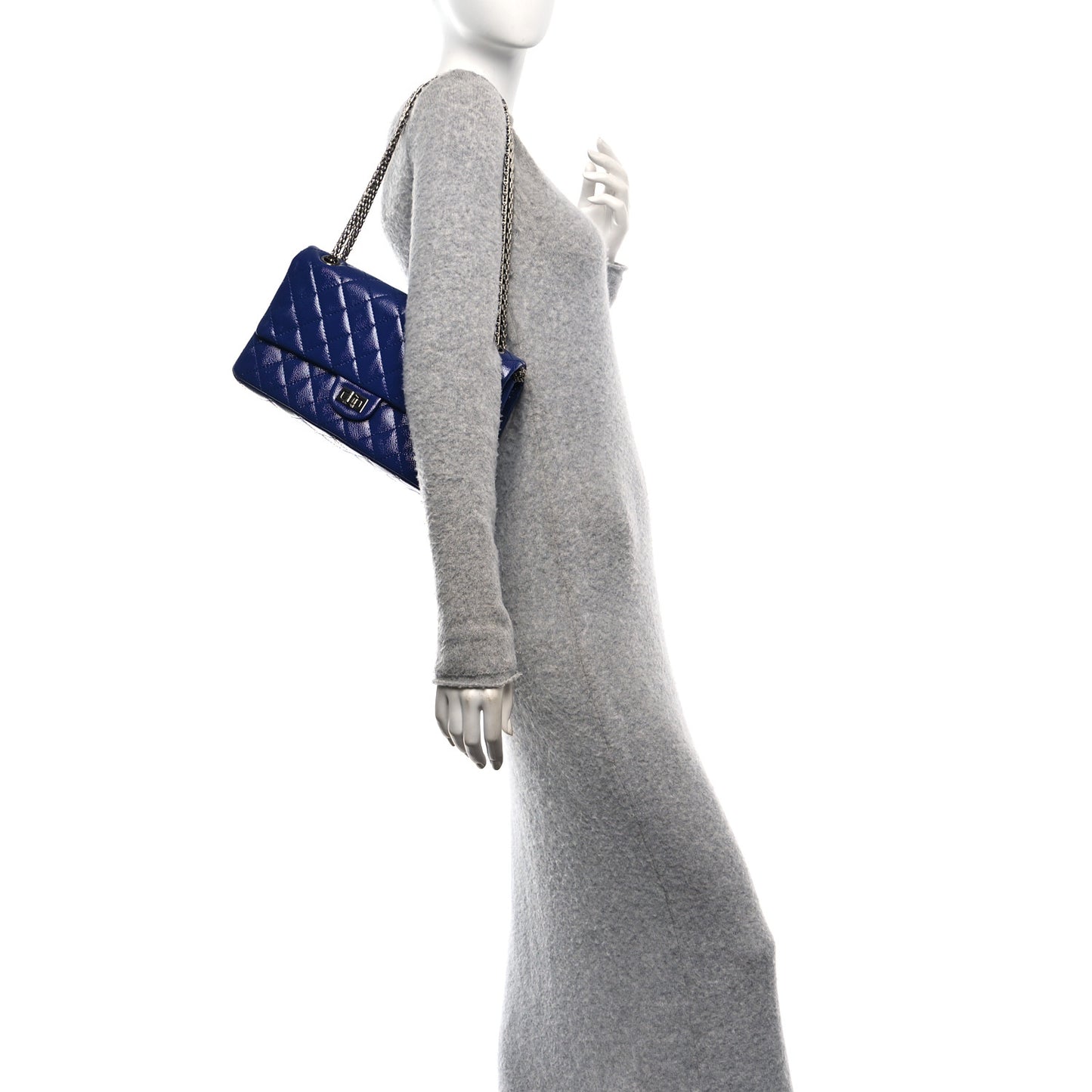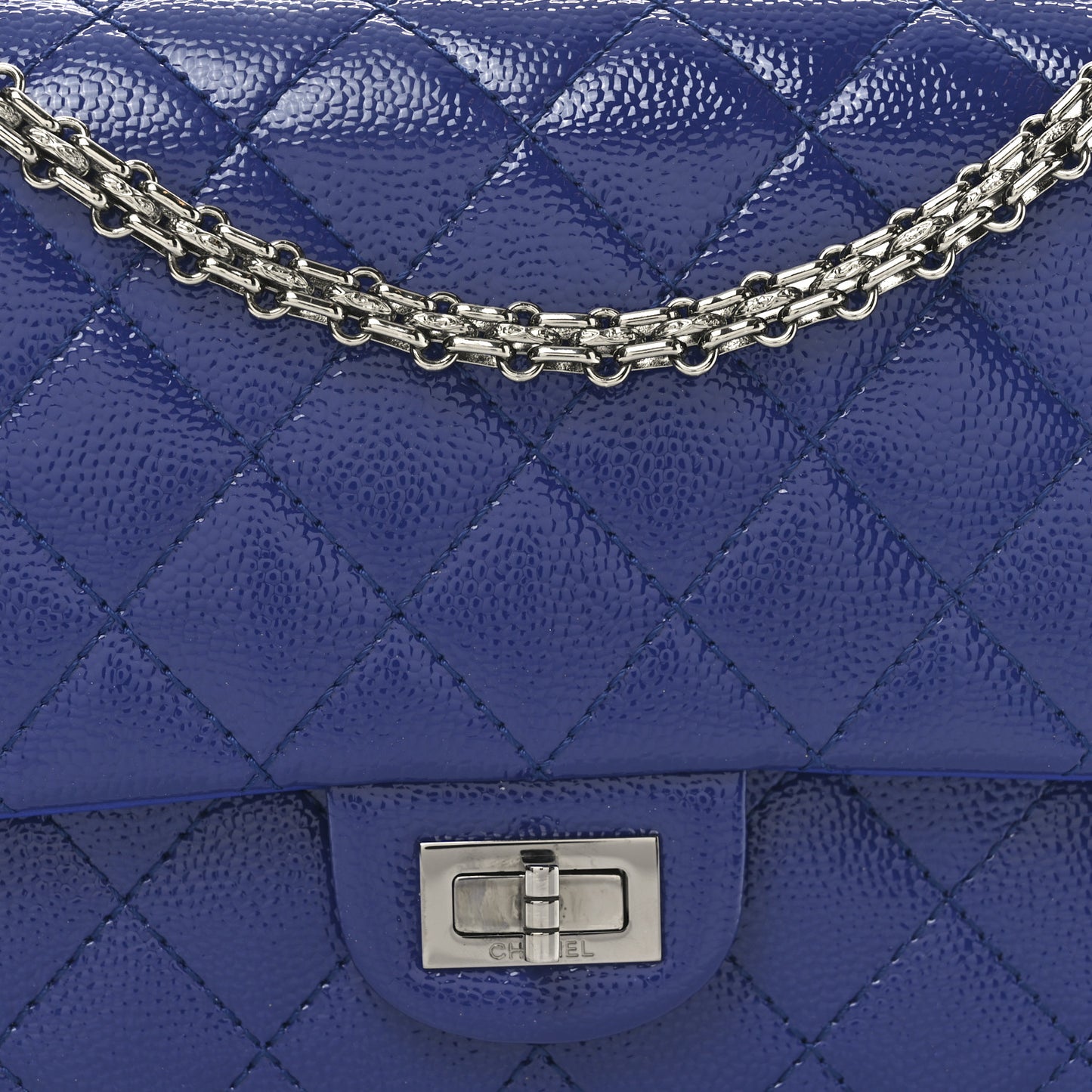 This is an authentic CHANEL Patent Caviar Quilted 2.55 Reissue 226 Flap in Navy Blue. This stylish shoulder bag is crafted of diamond-quilted patent caviar leather in navy blue. The shoulder bag features a polished ruthenium reissue chain shoulder strap, a front flap, and a Mademoiselle turn lock. his opens to reveal a second flap and a matching leather interior with flat pockets.Follow this item for alerts. Chanel is a registered trademark of Chanel. FASHIONPHILE is not affiliated with Chanel.