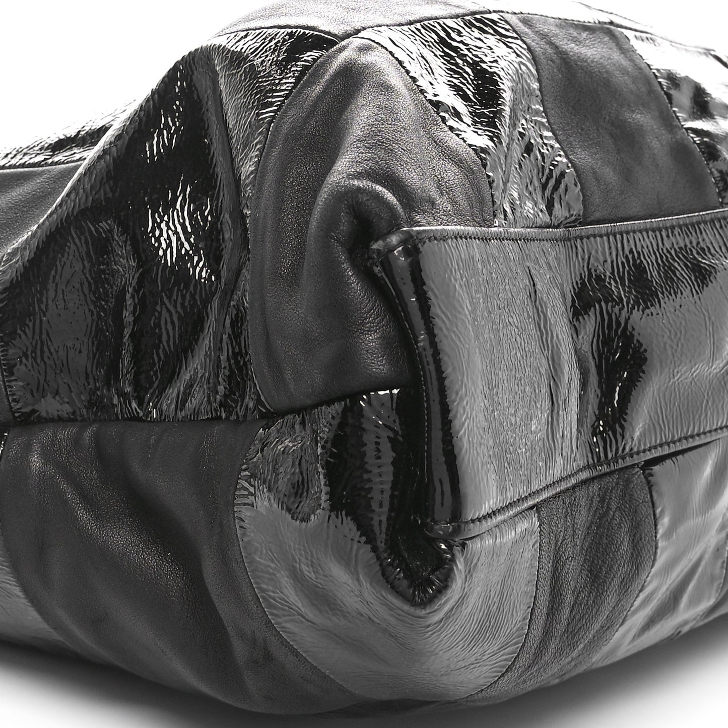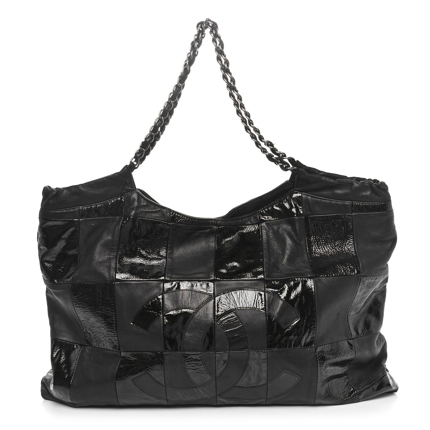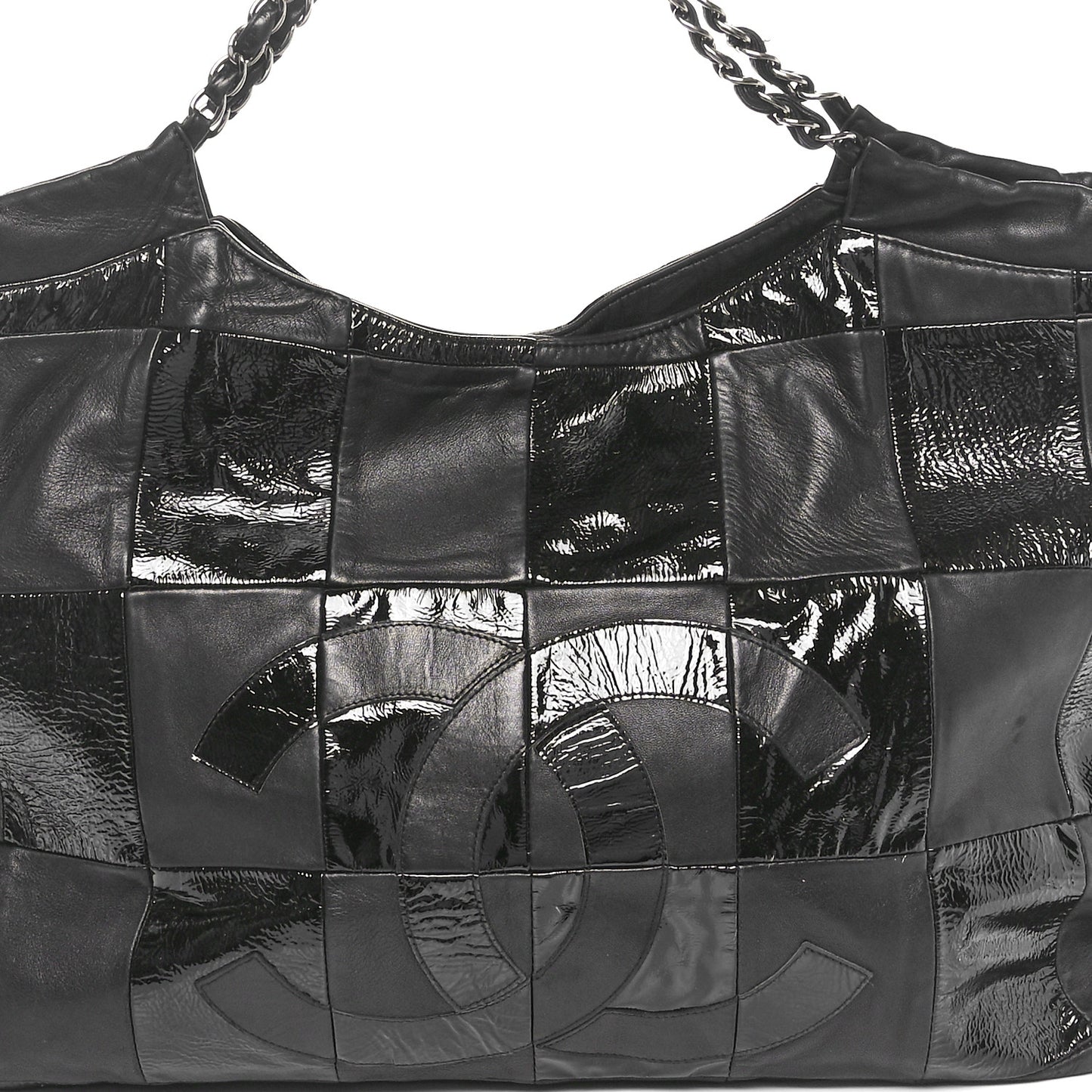 This is an authentic CHANEL Patent Patchwork Large Brooklyn Tote in Black. This chic tote is finely crafted of black matte and patent leather squares. The bag features polished silver chainlink leather threaded shoulder straps and a large patchwork CC Chanel logo on the front. The top opens with a magnet to a gray satin interior with zipper and patch pockets and a strap with lobster claw to attach to your accessories for easy access.Follow this item for alerts. Chanel is a registered trademark of Chanel. FASHIONPHILE is not affiliated with Chanel.