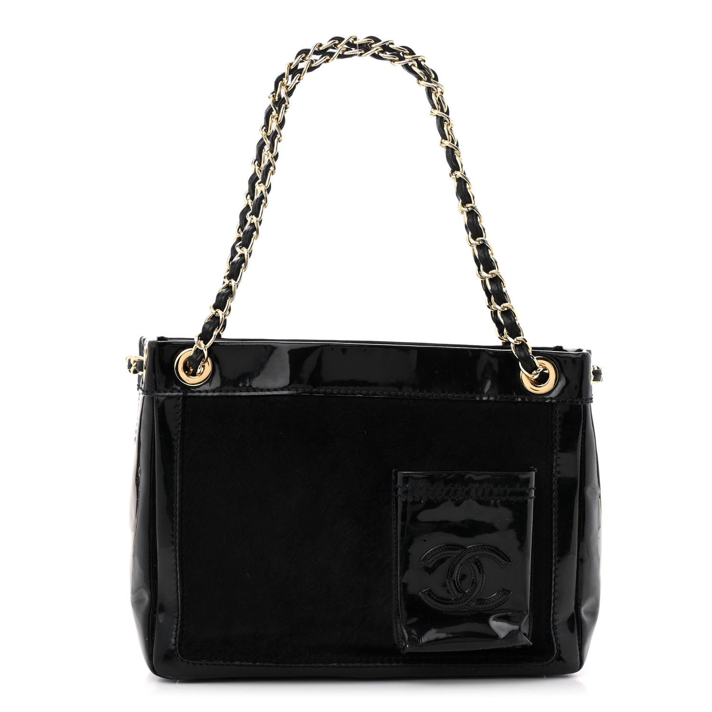 This is an authentic CHANEL Patent Pony Hair Small Pocket Tote in Black. This super-chic tote is crafted of black patent with black pony hair. The bag features an exterior pocket with a stitched CC logo and a gold chain leather threaded shoulder strap. The top opens to a spacious black fabric interior with zipper pockets.Follow this item for alerts. Chanel is a registered trademark of Chanel. FASHIONPHILE is not affiliated with Chanel.