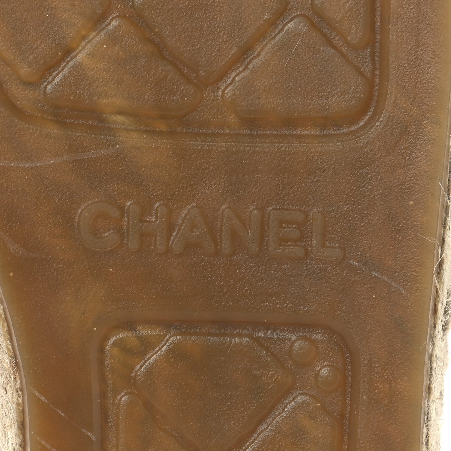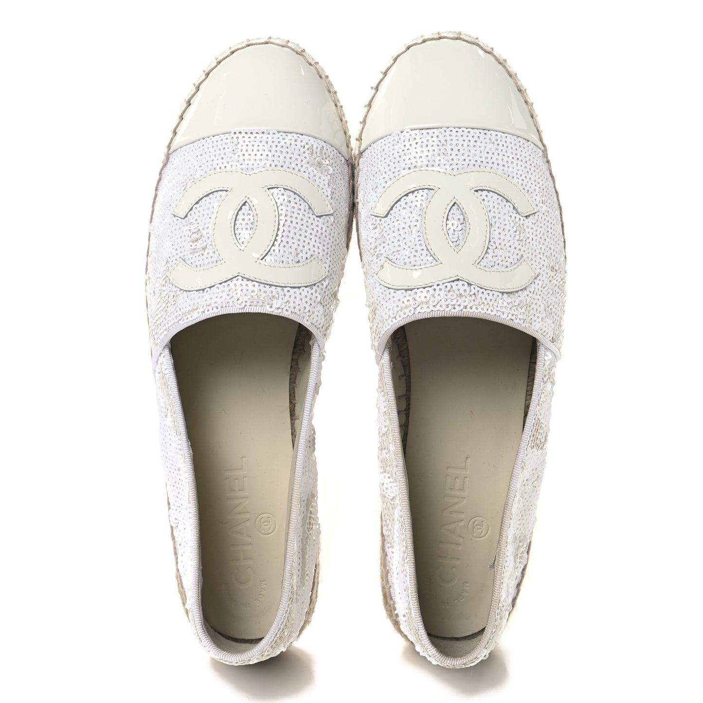 This is an authentic pair of CHANEL Patent Sequin CC Espadrilles size 40 in White. These casual yet chic flats feature double midsoles with uppers covered in white sequins. They feature a prominently stitched patent white Chanel CC logo and have a cap toe of white patent leather.Follow this item for alerts. Chanel is a registered trademark of Chanel. FASHIONPHILE is not affiliated with Chanel.
