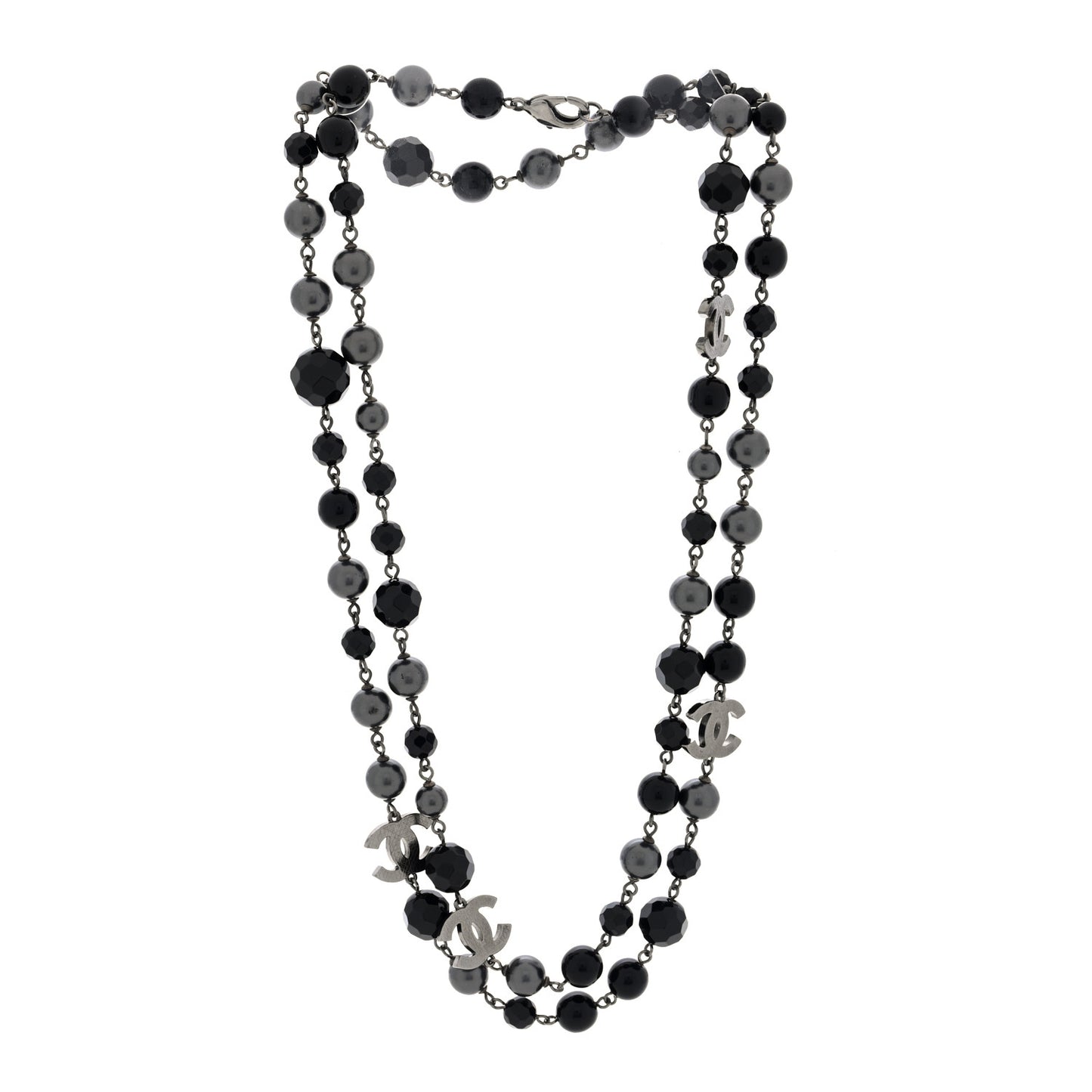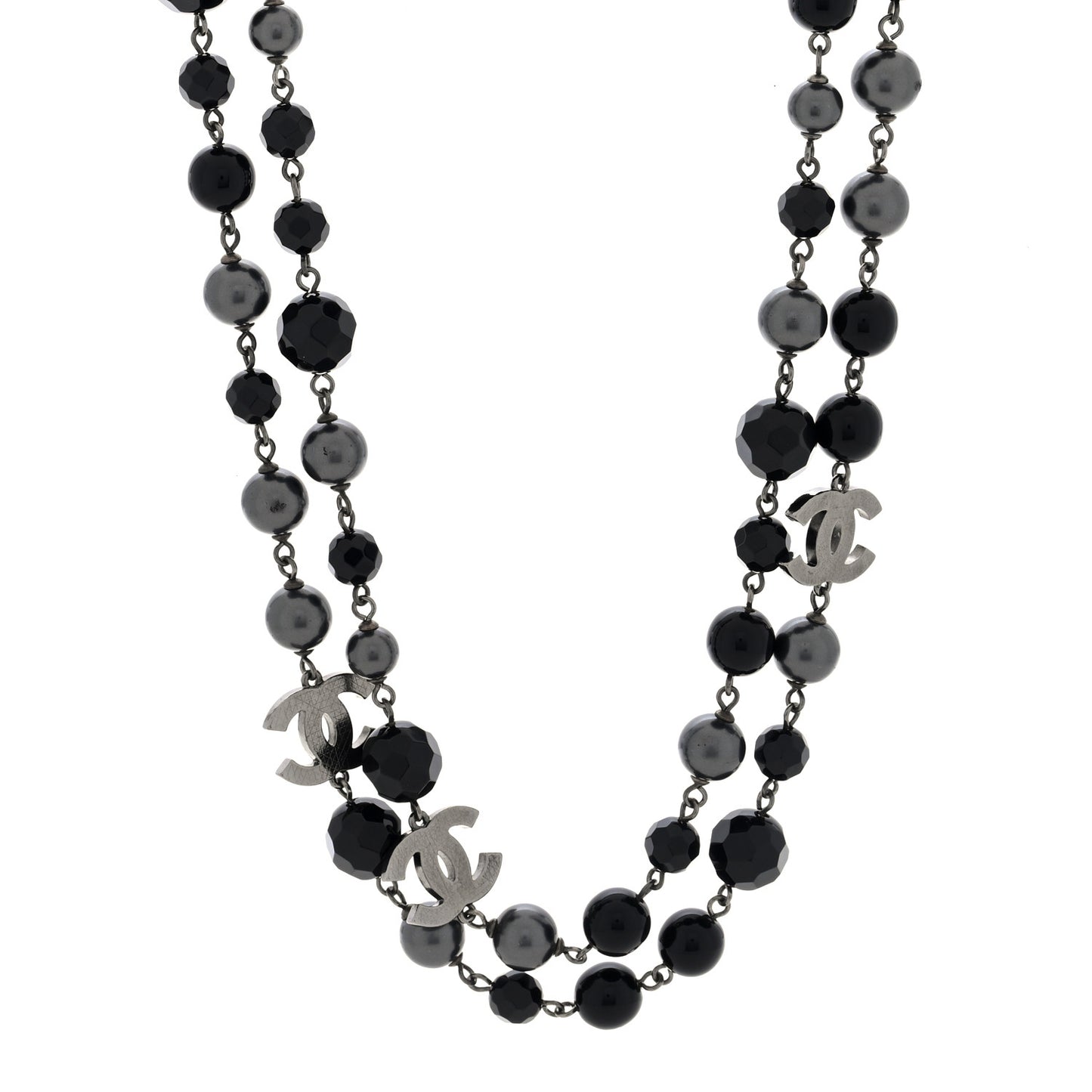 This is an authentic CHANEL Pearl Bead Enamel CC Long Necklace in Silver, Black and Grey. This elegant necklace is crafted of smooth black beads dispersed with gray resin pearls as well as the occasional silver Chanel CC logo.Follow this item for alerts. Chanel is a registered trademark of Chanel. FASHIONPHILE is not affiliated with Chanel.