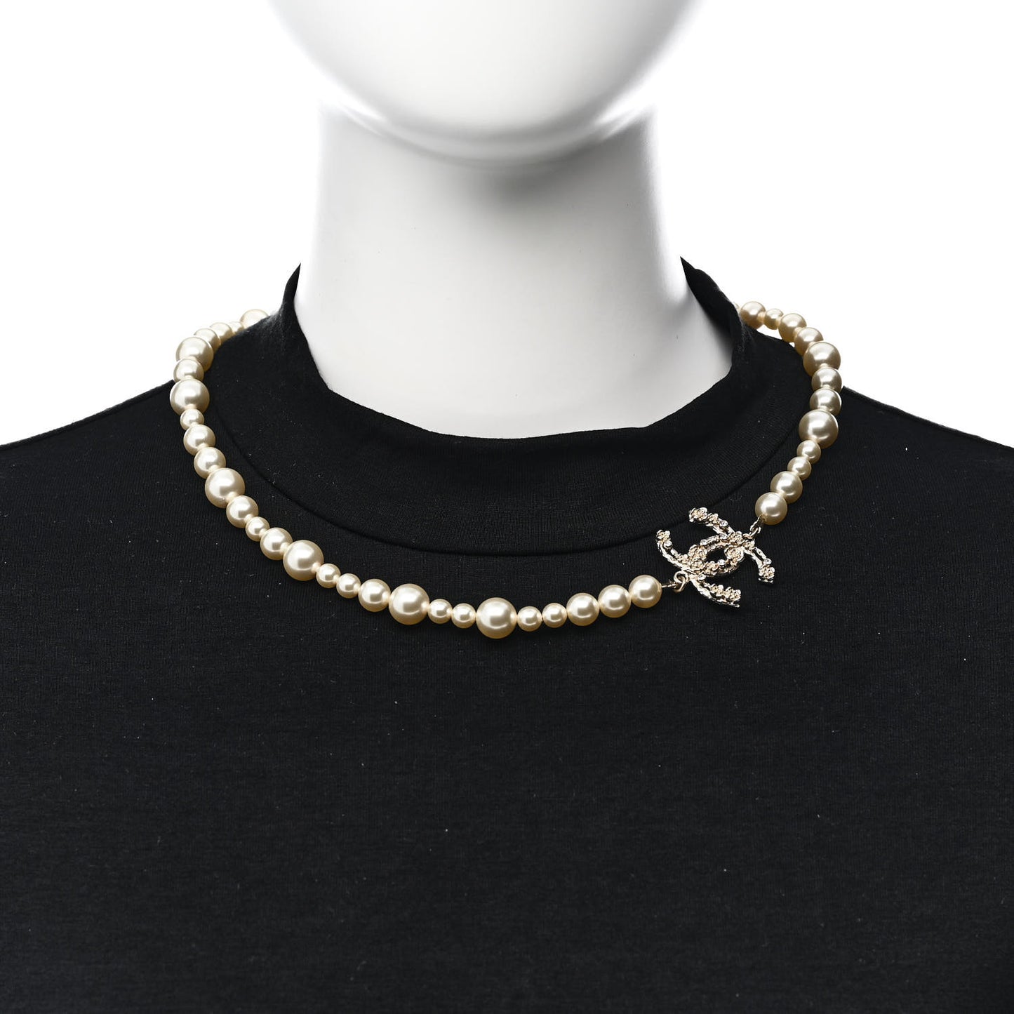This is an authentic CHANEL Pearl Crystal CC Camellia Short Necklace in Gold. This lovely necklace is crafted with faux pearls and a texturized gold Chanel CC embellished with crystals.Follow this item for alerts. Chanel is a registered trademark of Chanel. FASHIONPHILE is not affiliated with Chanel.