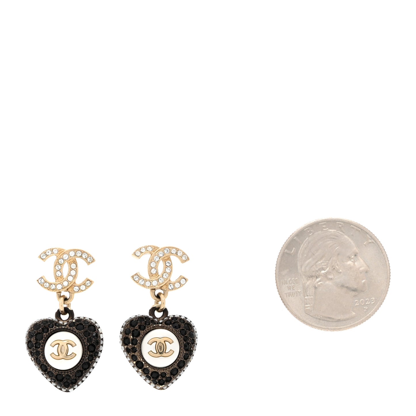 This is an authentic pair of CHANEL Pearl Crystal CC Heart Drop Earrings in Gold, Black and White. These earrings are crafted in a gold-tone CC logo and feature a white resin pearl in a shape of a heart.Follow this item for alerts. Chanel is a registered trademark of Chanel. FASHIONPHILE is not affiliated with Chanel.