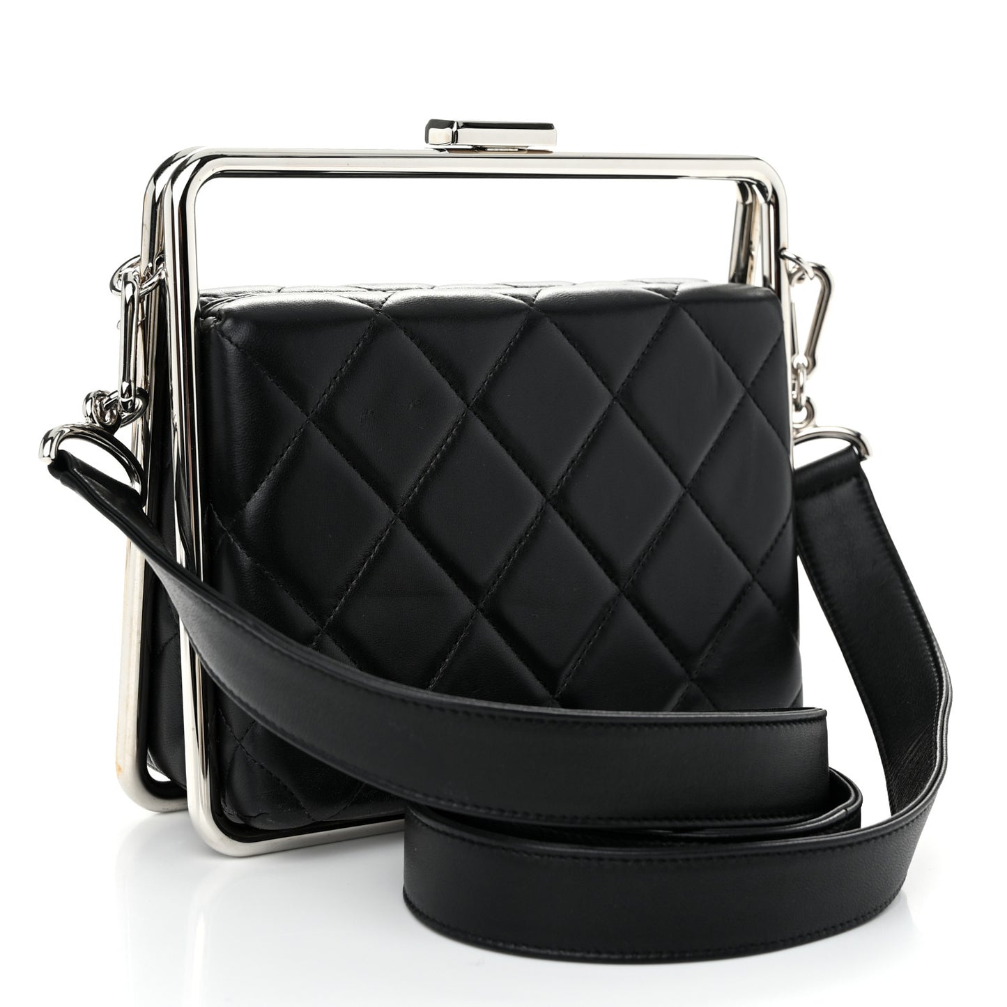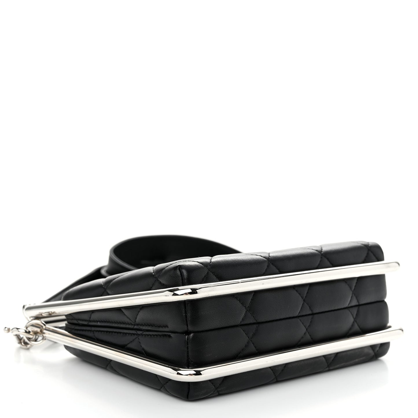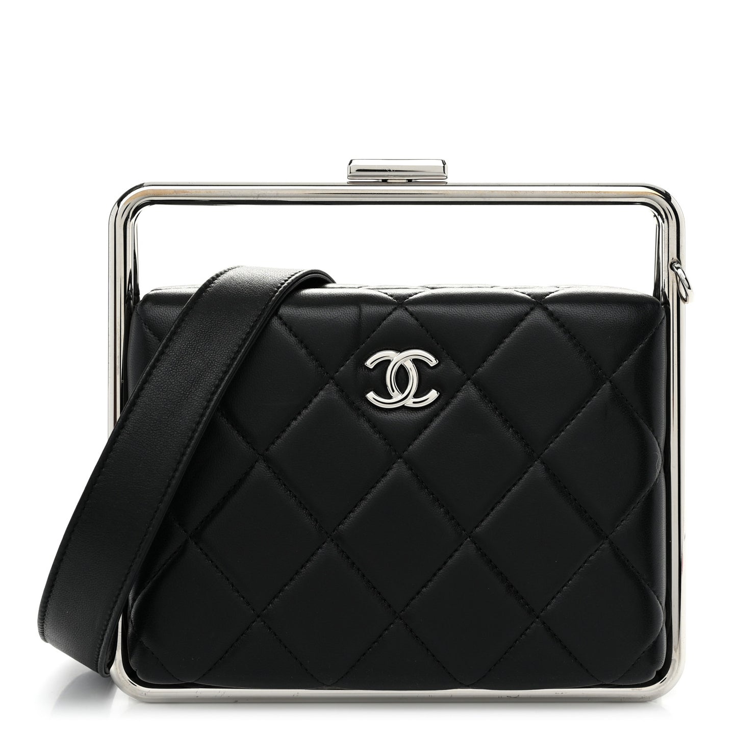 This is an authentic CHANEL Quilted Lambskin Metal Bar Clutch Bag in Black. This stunning bag is beautifully crafted of lambskin leather in black. The bag features a silver bar frame, an optional matching leather shoulder strap, and a silver CC kiss lock that opens to a black fabric interior with a small patch pocket.Follow this item for alerts. Chanel is a registered trademark of Chanel. FASHIONPHILE is not affiliated with Chanel.