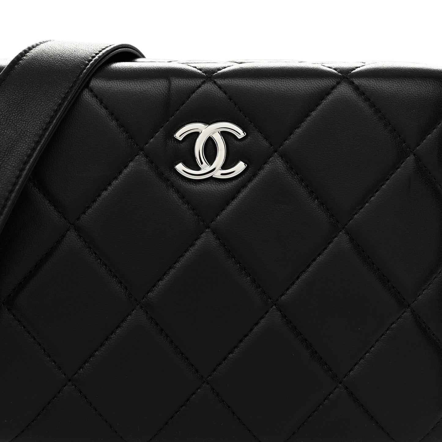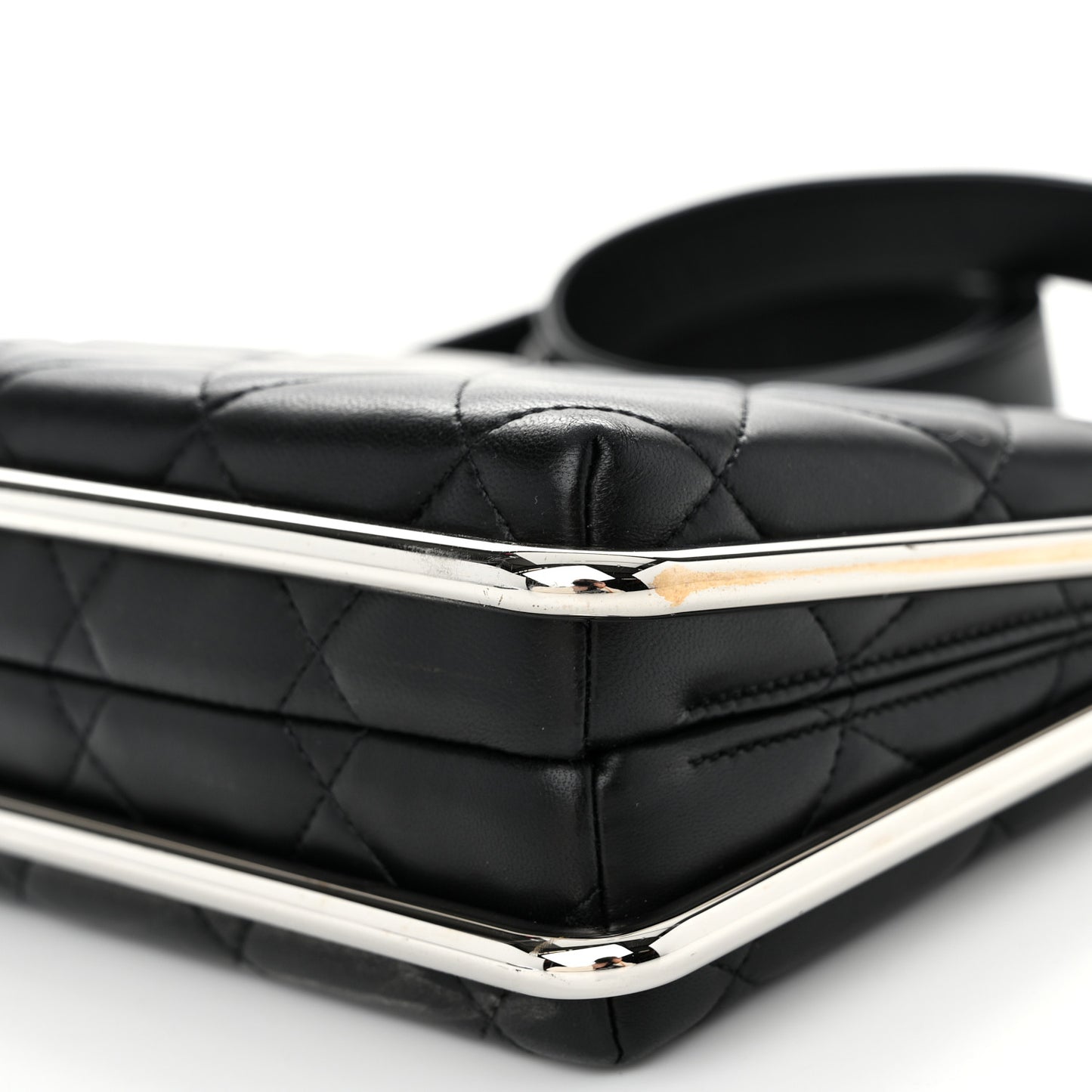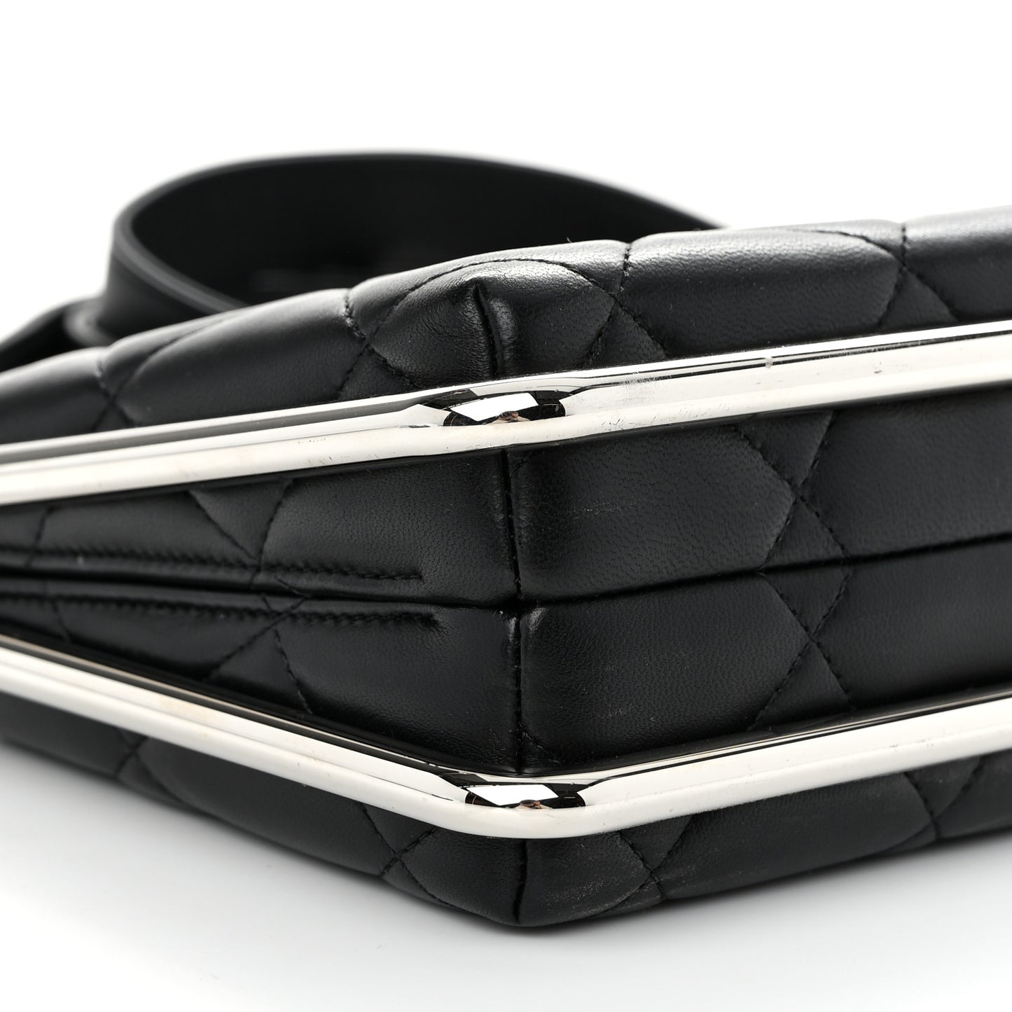 This is an authentic CHANEL Quilted Lambskin Metal Bar Clutch Bag in Black. This stunning bag is beautifully crafted of lambskin leather in black. The bag features a silver bar frame, an optional matching leather shoulder strap, and a silver CC kiss lock that opens to a black fabric interior with a small patch pocket.Follow this item for alerts. Chanel is a registered trademark of Chanel. FASHIONPHILE is not affiliated with Chanel.