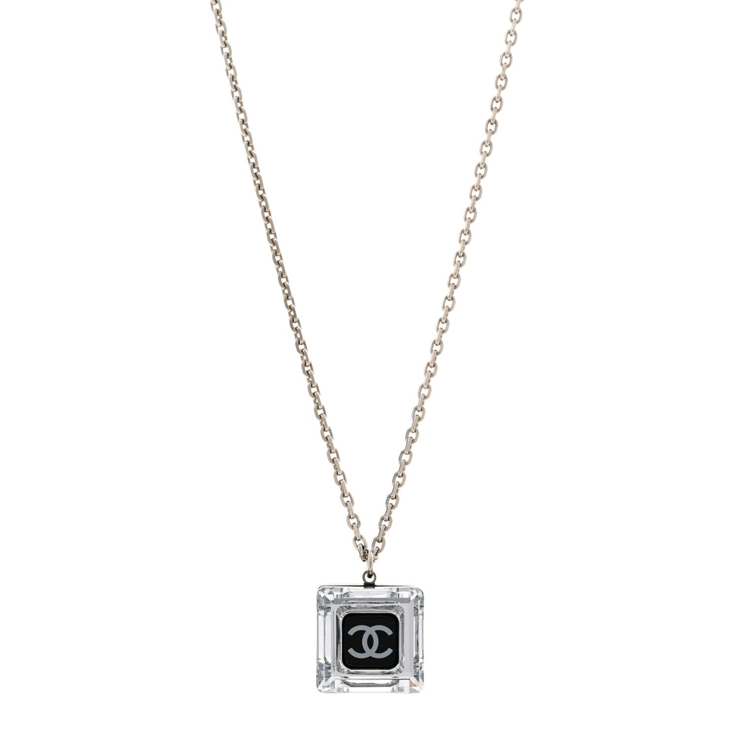 This is an authentic CHANEL Resin Strass Geometric Square CC Necklace in Black. This stunning pendant necklace features a square resin body with a Chanel CC logo on a silver tone chain.Follow this item for alerts. Chanel is a registered trademark of Chanel. FASHIONPHILE is not affiliated with Chanel.