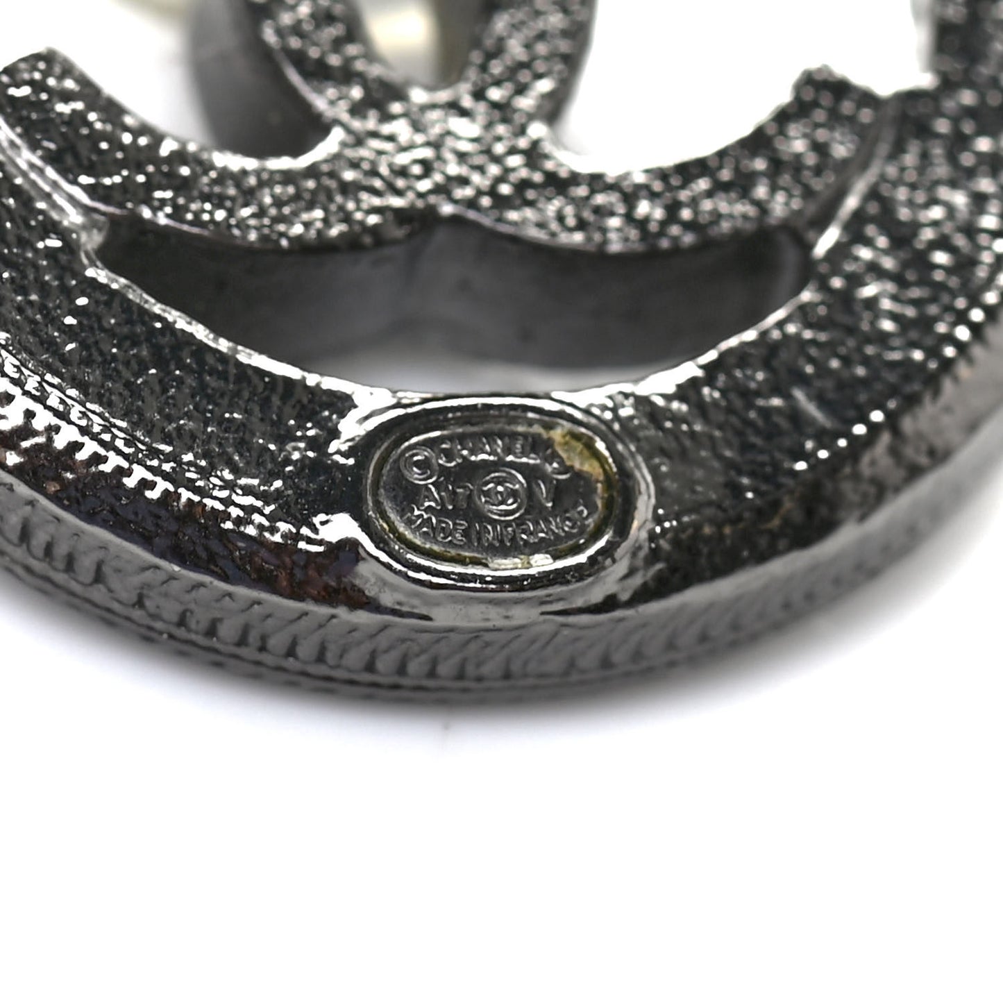 This is an authentic pair of CHANEL Ruthenium Pearl CC Round Earrings in Dark Grey. These ruthenium earrings feature dark grey resin pearls that encircled the CC logo.Follow this item for alerts. Chanel is a registered trademark of Chanel. FASHIONPHILE is not affiliated with Chanel.