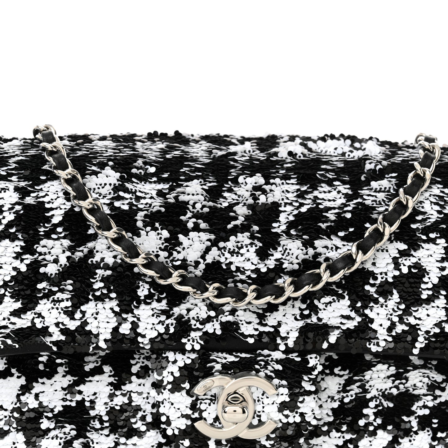 This is an authentic CHANEL Sequin Houndstooth Small Flap in Black and White. This stunning shoulder bag is crafted of satin fabric, covered in black and white sequins in a houndstooth print. The bag features a ruthenium chain-link leather threaded shoulder strap and a matching Chanel CC turn lock. The flap opens to a black leather interior with a patch and zipper pockets.Follow this item for alerts. Chanel is a registered trademark of Chanel. FASHIONPHILE is not affiliated with Chanel.