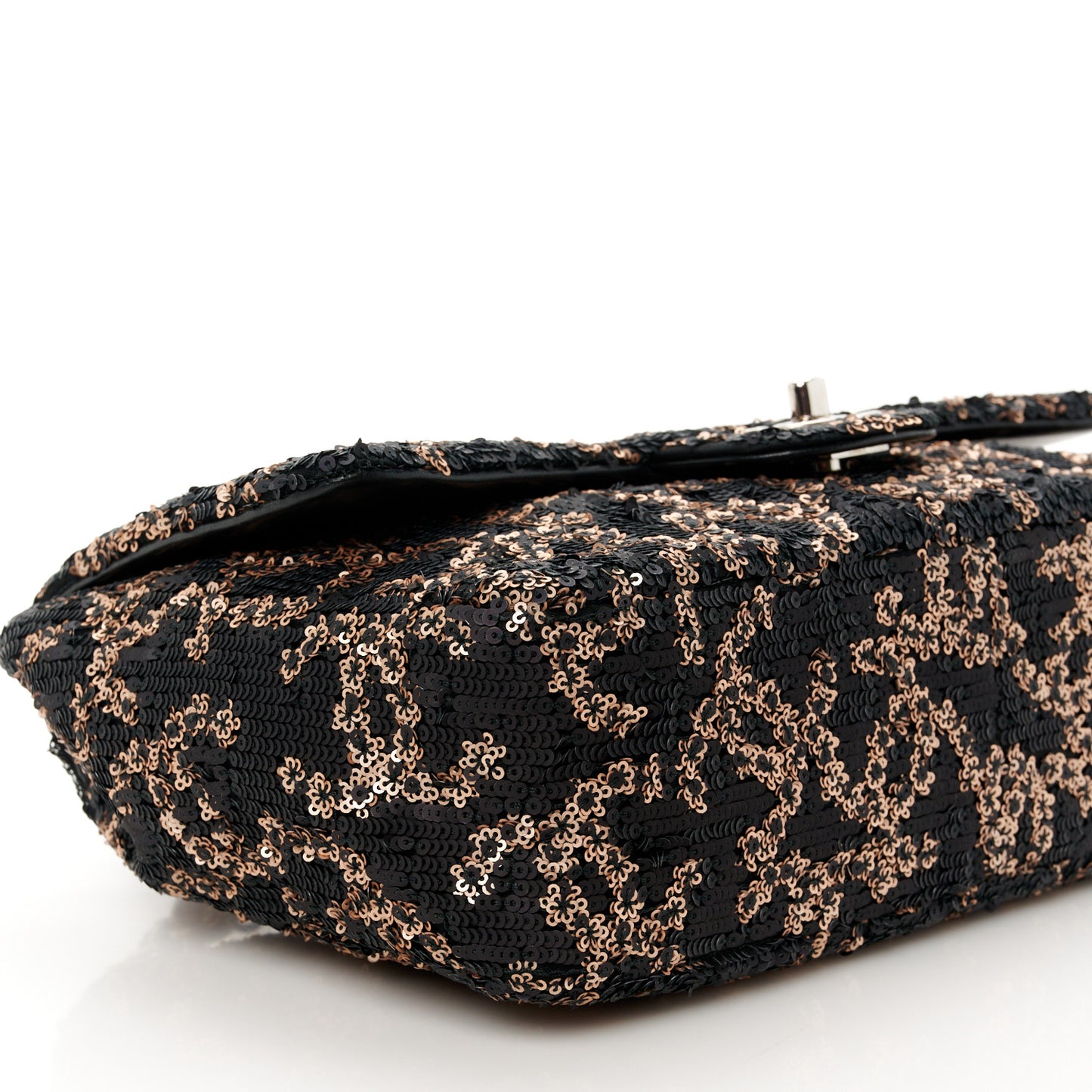 This is an authentic CHANEL Sequin Medium Single Flap in Black and Gold. This stunning shoulder bag is crafted of lambskin leather embellished with sparkling sequins. The bag features gold chain link leather threaded shoulder straps and a light gold Chanel CC turn lock. The flap opens to a black leather and satin interior with a zipper pocket.Follow this item for alerts. Chanel is a registered trademark of Chanel. FASHIONPHILE is not affiliated with Chanel.