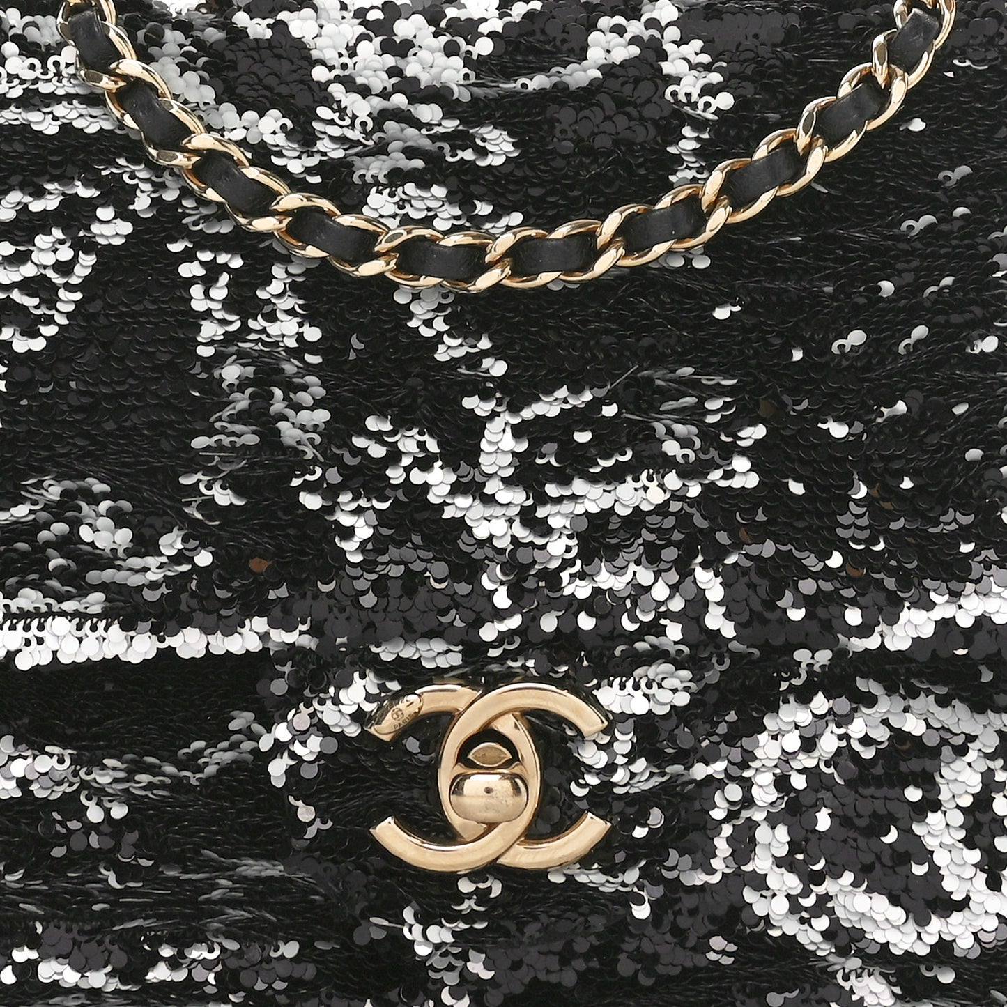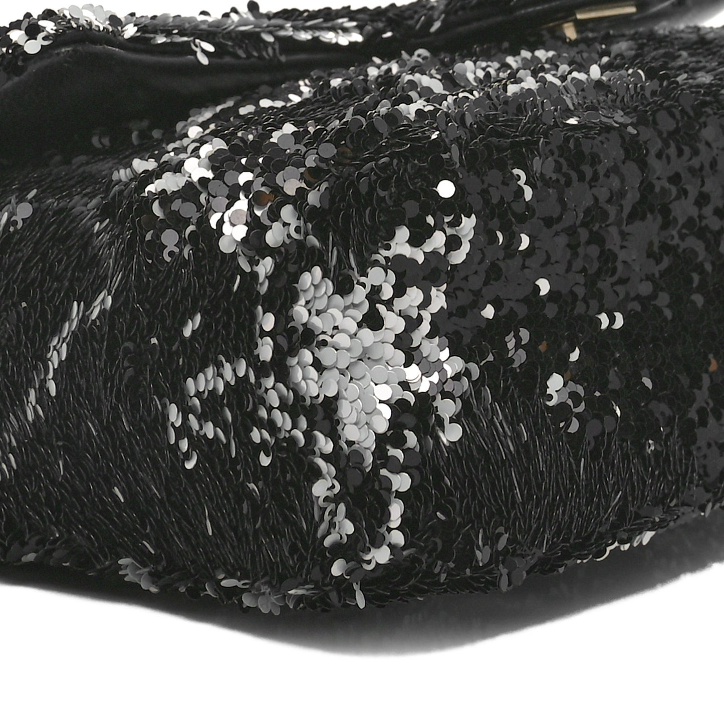 This is an authentic CHANEL Sequin Small Single Flap Rectangular Flap in Black and Silver. This stylish shoulder bag is crafted entirely of individual black and silver sequins with a bow design and classic CC signature motif. The bag features gold chain link leather threaded shoulder straps and a Chanel CC logo. This opens to a black leather interior with a zipper pocket. This is an ideal evening bag for your essentials with the timeless style only from Chanel!Follow this item for alerts. Chanel is a registered trademark of Chanel. FASHIONPHILE is not affiliated with Chanel.