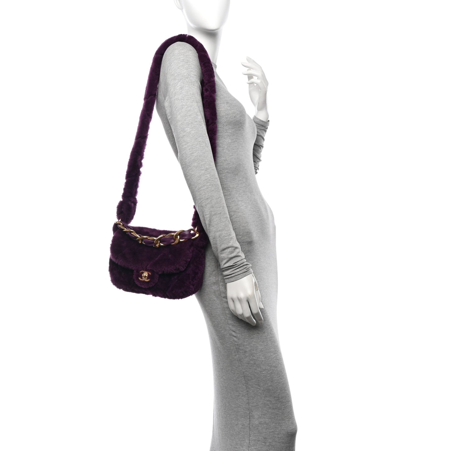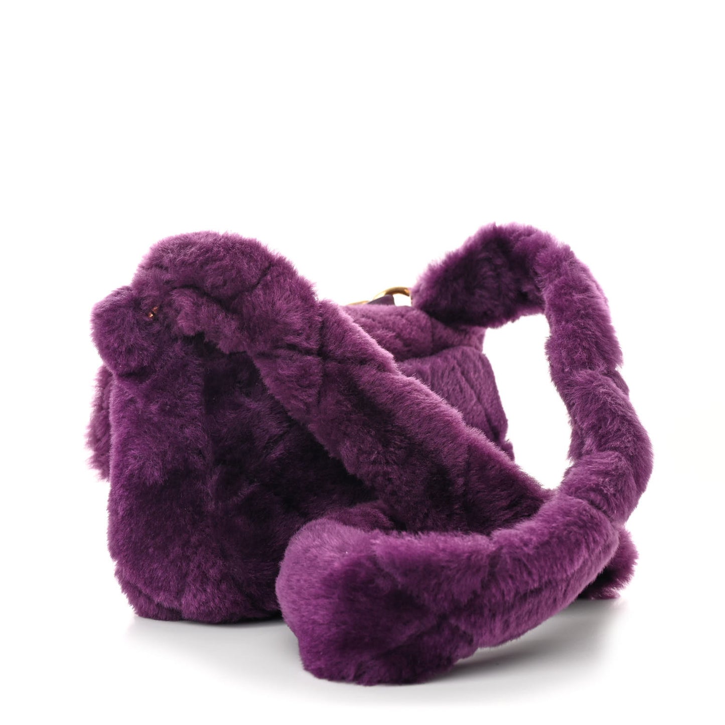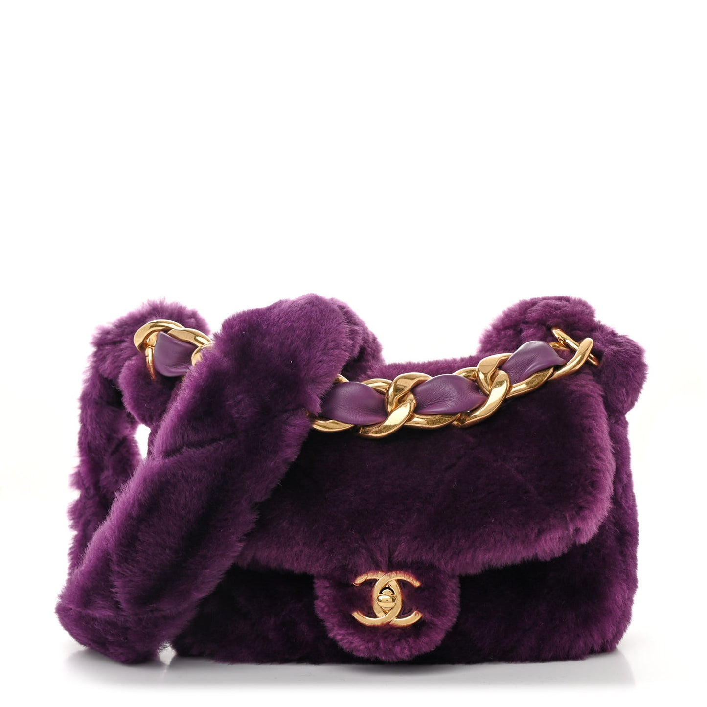 This is an authentic CHANEL Shearling Lambskin Quilted Flap Bag in Purple. This stylish shoulder bag is crafted in purple shearling with diamond stitching. The bag features an aged gold chain link top handle threaded with leather and long matching shearling shoulder strap. This bag also features a front flap with a matching aged gold classic CC turn lock and opens to a matching leather interior with a zipper pocket.Follow this item for alerts. Chanel is a registered trademark of Chanel. FASHIONPHILE is not affiliated with Chanel.