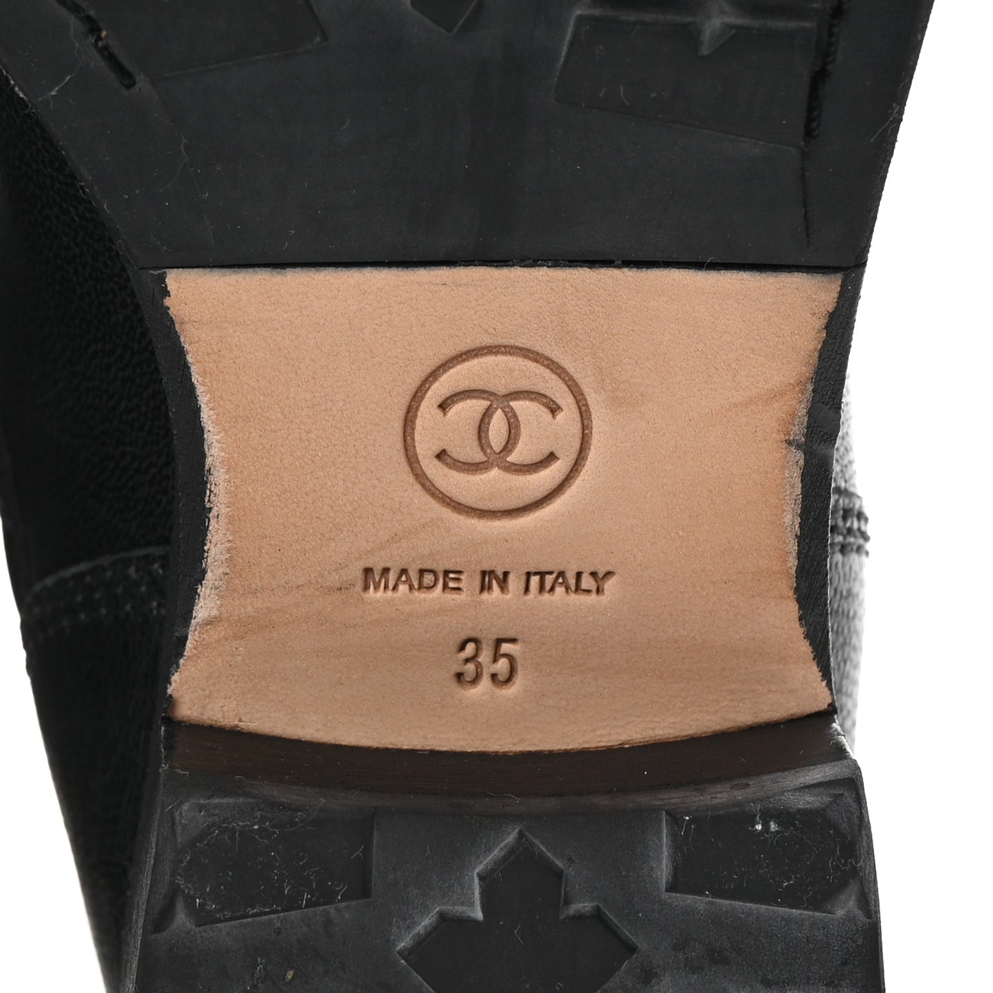 This is an authentic pair of CHANEL Sheepskin Quilted CC Tall Lace Up Combat Boots size 35 in Black. These stunning boots are crafted of solid black sheepskin leather. They have a sturdy rubber base sole with laces the entire length, the tongue has the icons CC logo at the top and there are a quilted patch and zippers along with the side panels.Follow this item for alerts. Chanel is a registered trademark of Chanel. FASHIONPHILE is not affiliated with Chanel.