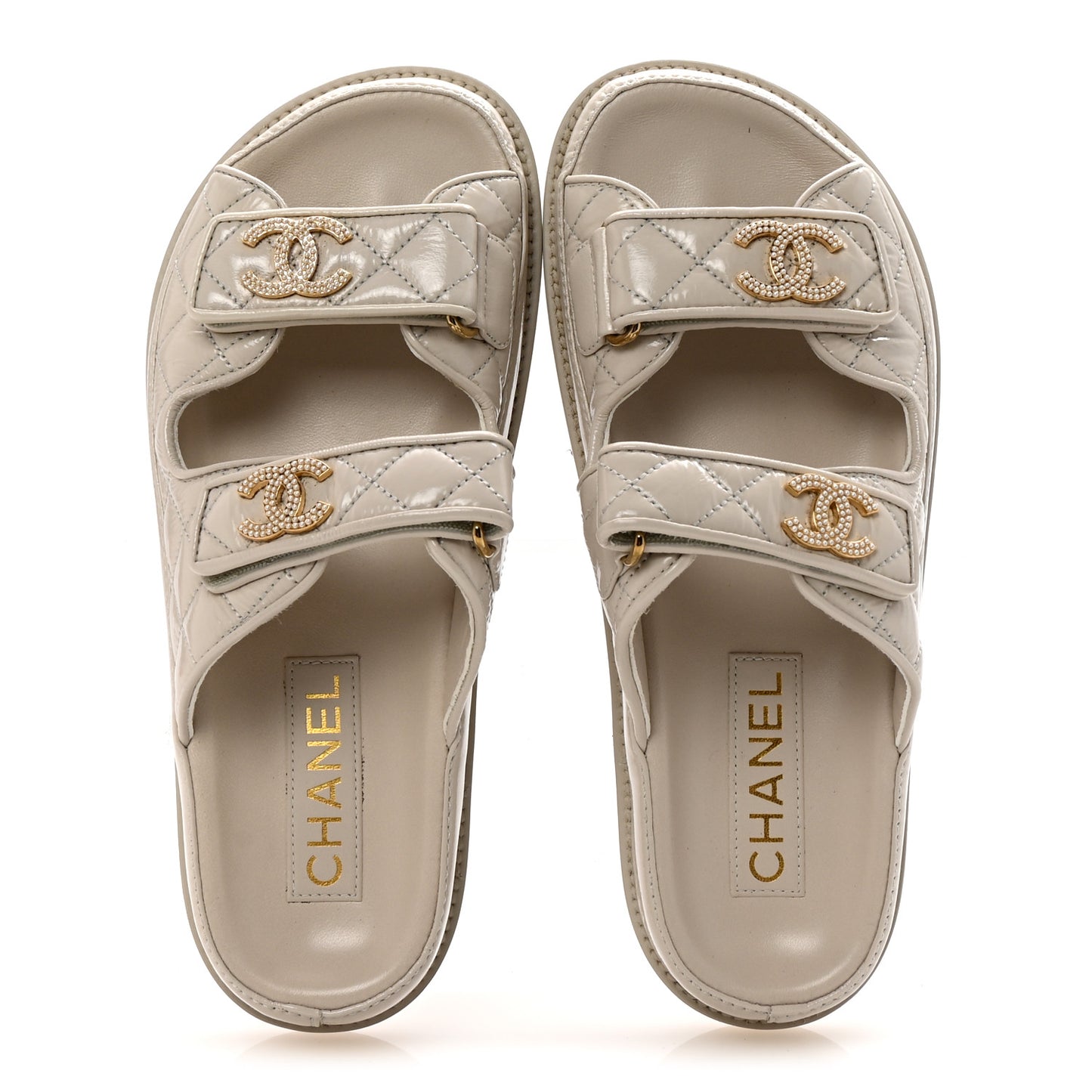 Chanel/ Accessories/ Shoes /Chanel Shiny Calfskin Pearl Quilted Velcro Dad CC Slide Sandals 36.5 Light Beige