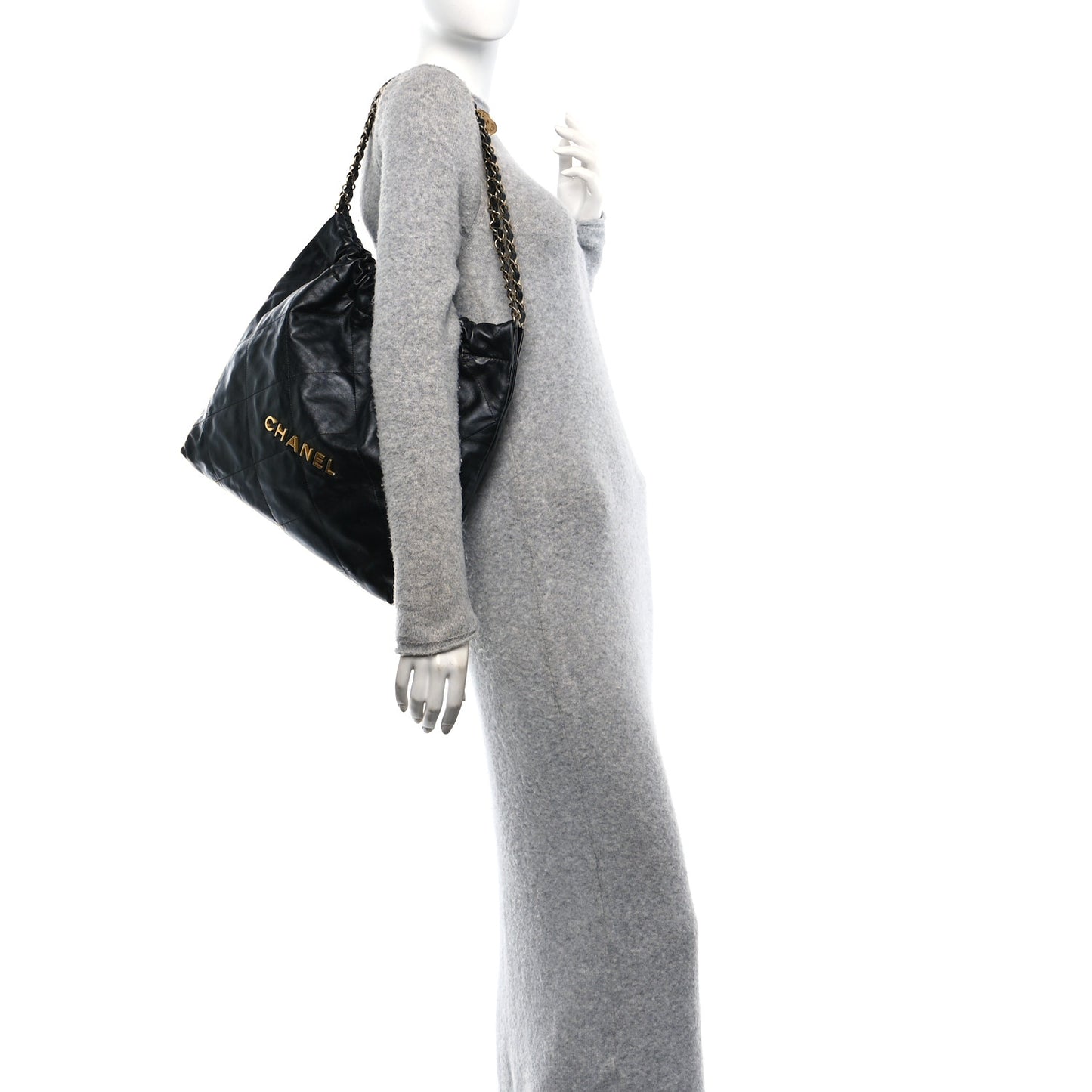 This is an authentic CHANEL Shiny Calfskin Quilted Chanel 22 in Black. This handbag is crafted of diamond-stitched calfskin leather in black. It features leather-threaded gold chain shoulder straps and a gold Chanel logo on the front. The magnetic top opens to a black fabric interior with a zipper pocket and a removable pouch.Follow this item for alerts. Chanel is a registered trademark of Chanel. FASHIONPHILE is not affiliated with Chanel.