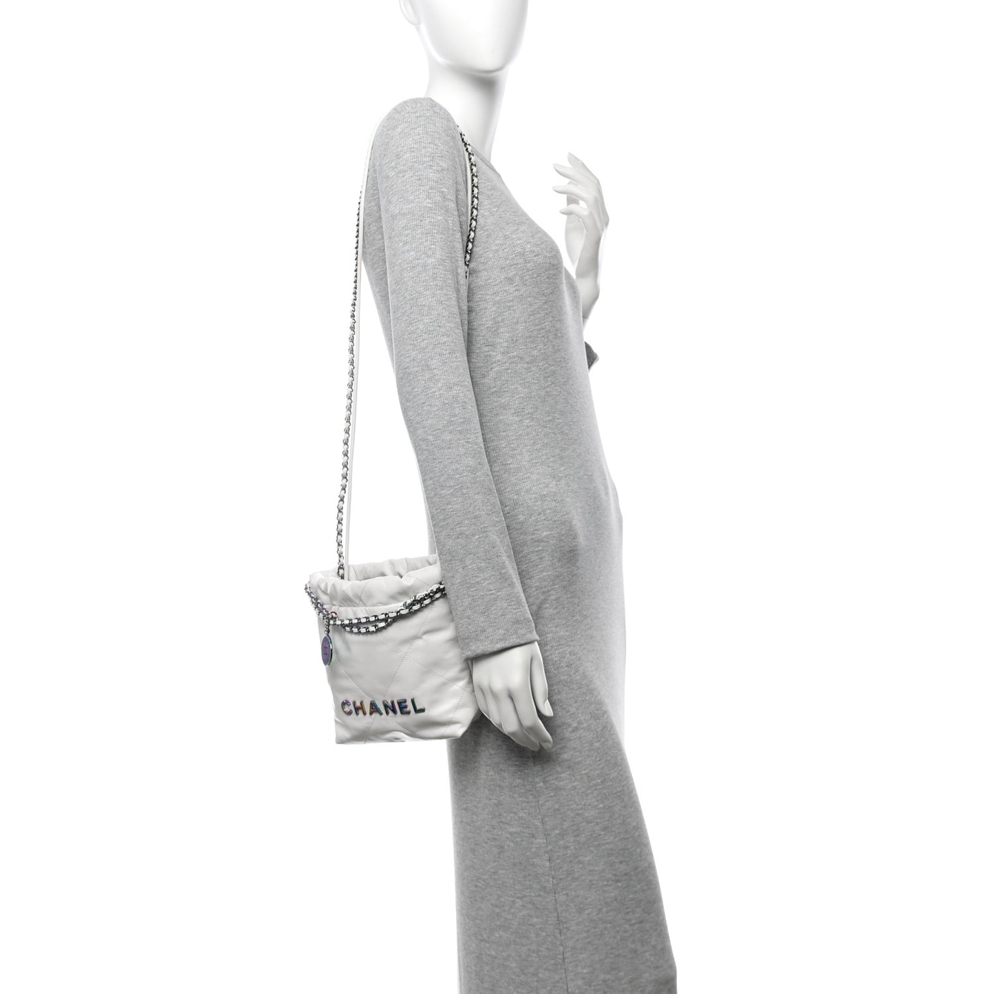 This is an authentic CHANEL Shiny Calfskin Quilted Rainbow Mini Chanel 22 in White. This chic bag is crafted of calfskin diamond-stitched leather in white. The bag features a leather threaded iridescent chain link shoulder strap joined to a thin leather strap, a leather threaded chain link handle, an iridescent medallion as well as the Chanel logo. The bag opens to a beige diamond quilted fabric interior with a leather flat pocket.Follow this item for alerts. Chanel is a registered trademark of Chanel. FASHIONPHILE is not affiliated with Chanel.
