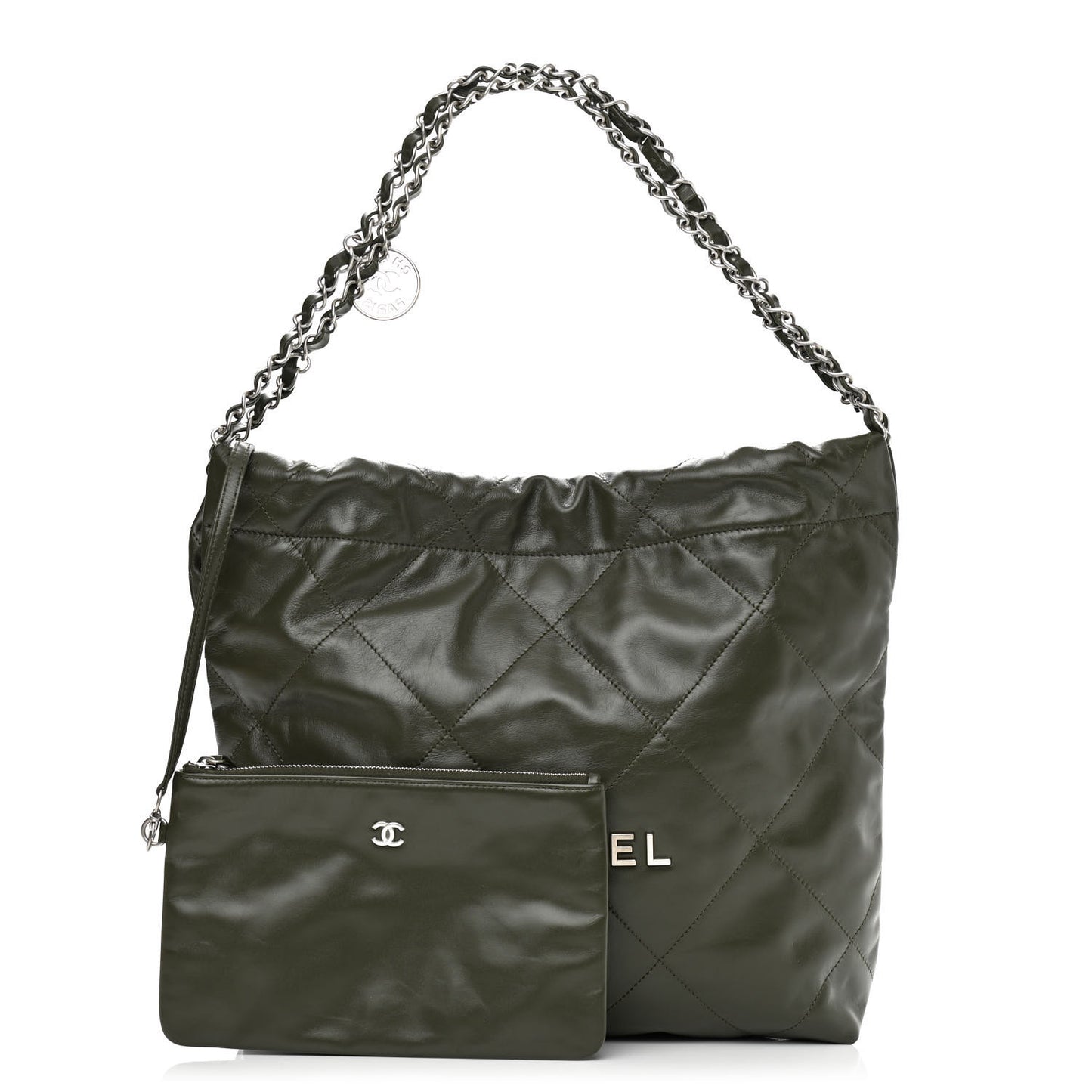 This is an authentic CHANEL Shiny Calfskin Quilted Small Chanel 22 in Khaki. This stylish handbag is crafted of diamond-stitched calfskin leather in olive green. The bag features leather threaded silver chain shoulder straps and a matching Chanel logo on the front. The open top with magnetic closure leads to a green quilted fabric interior with a pocket and matching removable pouch.Follow this item for alerts. Chanel is a registered trademark of Chanel. FASHIONPHILE is not affiliated with Chanel.