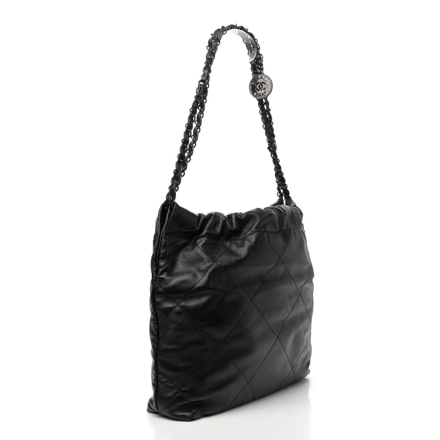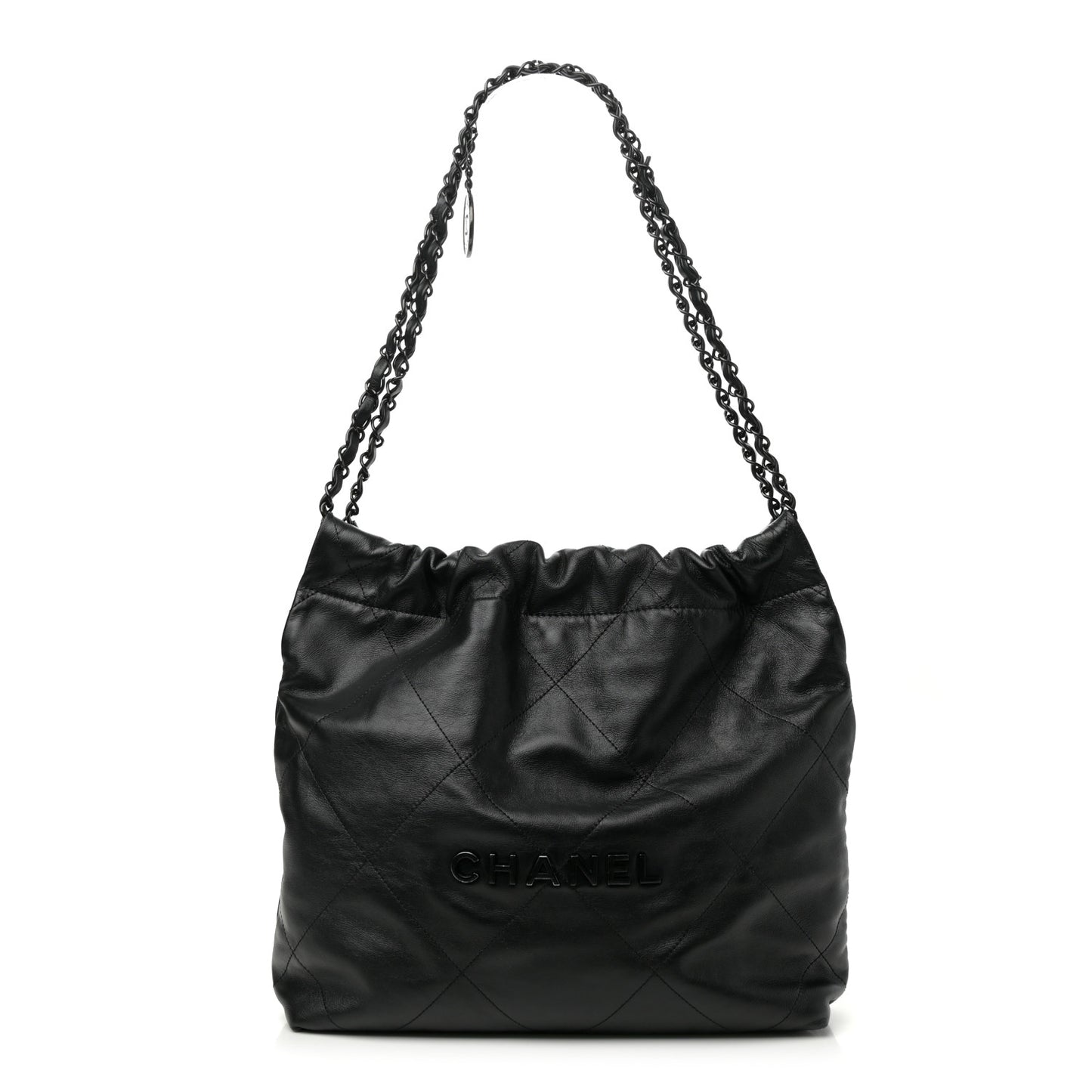 This is an authentic CHANEL Shiny Calfskin Quilted Small Chanel 22 in So Black. This drawstring bag is crafted of shiny diamond-stitched leather in black. This shoulder bag features a black chain threaded leather shoulder strap. The bag is open to a black diamond stitched fabric interior with a zipper pocket.Follow this item for alerts. Chanel is a registered trademark of Chanel. FASHIONPHILE is not affiliated with Chanel.