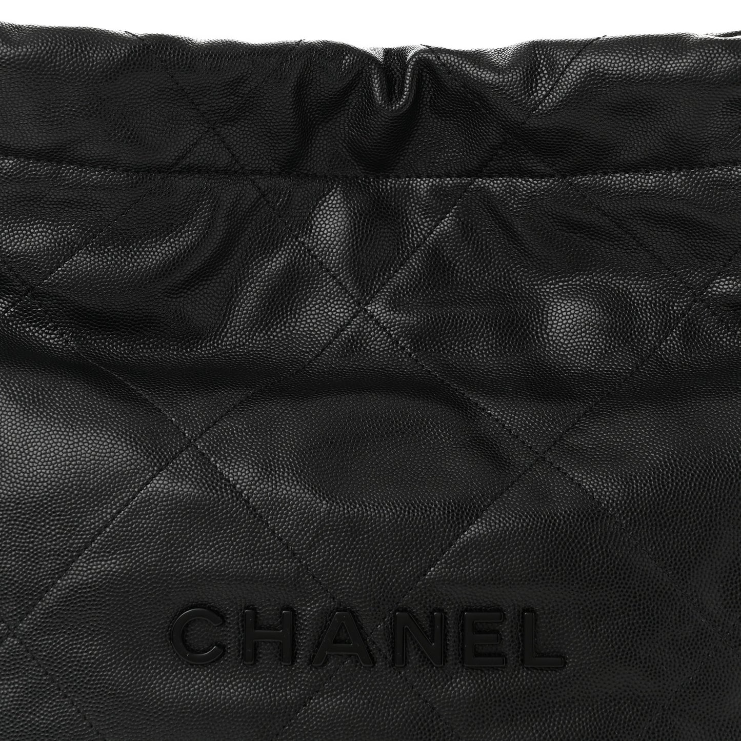 This is an authentic CHANEL Shiny Caviar Quilted Monochrome Small Chanel 22 in Black. This drawstring bag is crafted of textured and shiny diamond-stitched leather in black. This shoulder bag features a gold chain leather threaded shoulder strap. The bag is open to a black diamond stitched fabric interior with pockets and matching removable pouch.Follow this item for alerts. Chanel is a registered trademark of Chanel. FASHIONPHILE is not affiliated with Chanel.