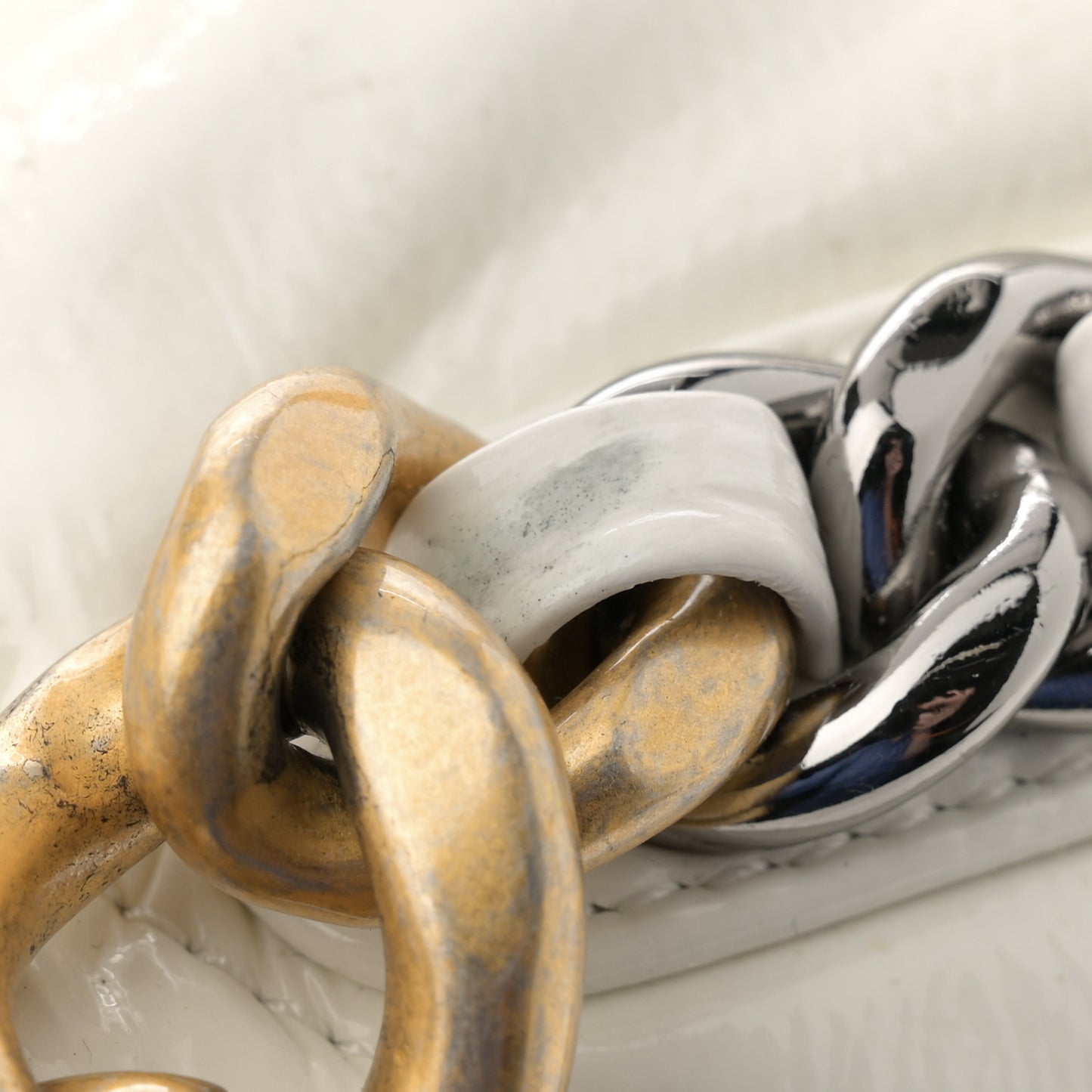 This is an authentic CHANEL Shiny Crumpled Calfskin Quilted Medium Chanel 19 Flap in White. This pillowy soft shoulder bag is crafted of oversized quilted patent calfskin leather in white. The refined bag features an aged gold chain detail CC turn-lock on the flap, a magnetic snap pocket at the rear, and a leather threaded gradient gold to ruthenium chain-link strap with a leather shoulder pad. The front flap opens to a beige fabric interior with a zipper pocket.Follow this item for alerts. Chanel is a registered trademark of Chanel. FASHIONPHILE is not affiliated with Chanel.